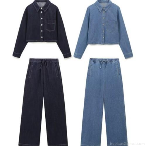 • Women's Casual Solid Color Denim Shirt Jacket And High Waist Wide Leg Pants Two Piece Set Long Sleeve Lapel Top Drawstring Trousers Streetwear