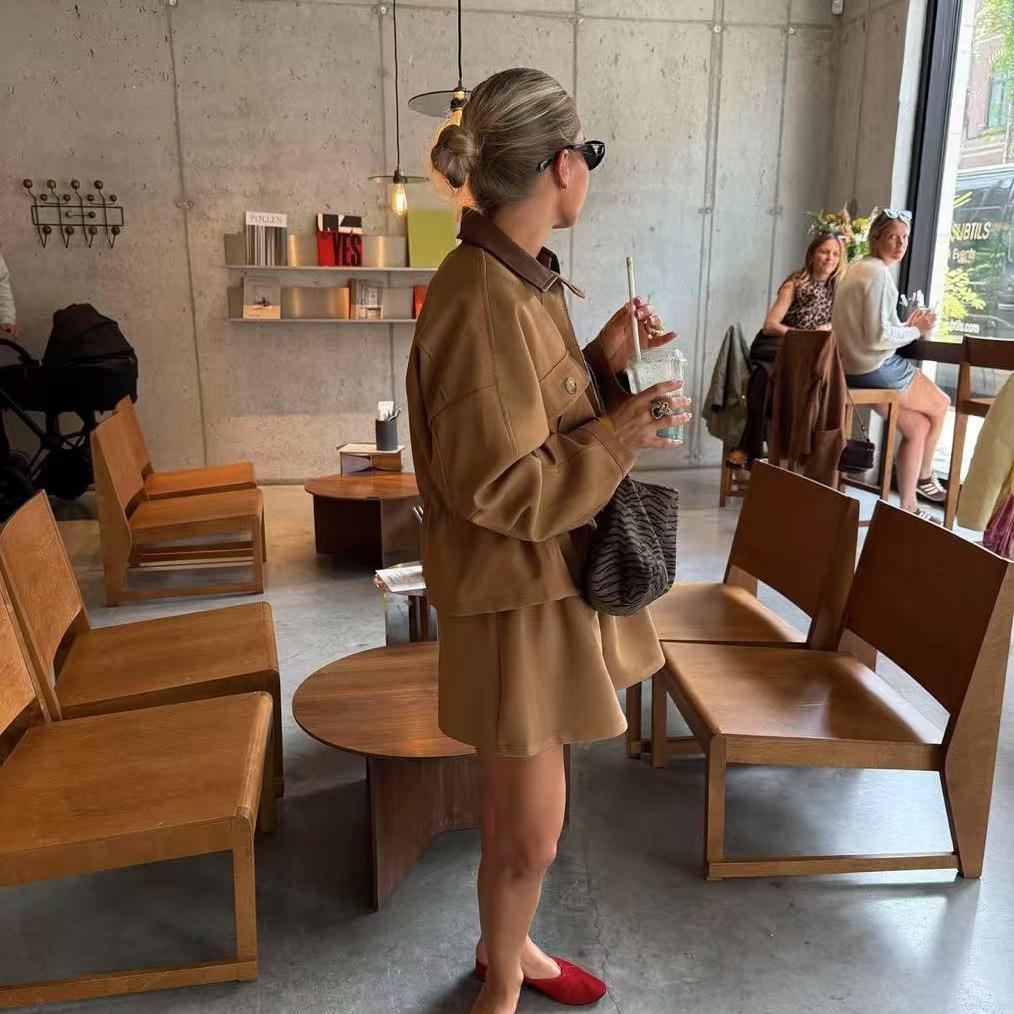 • Women's Casual Two Piece Outfits Fashion Zip Up Jacket With PU Leather Contrast Collar And High Waist Wide Leg Shorts Streetwear Khaki Polyester Sets
