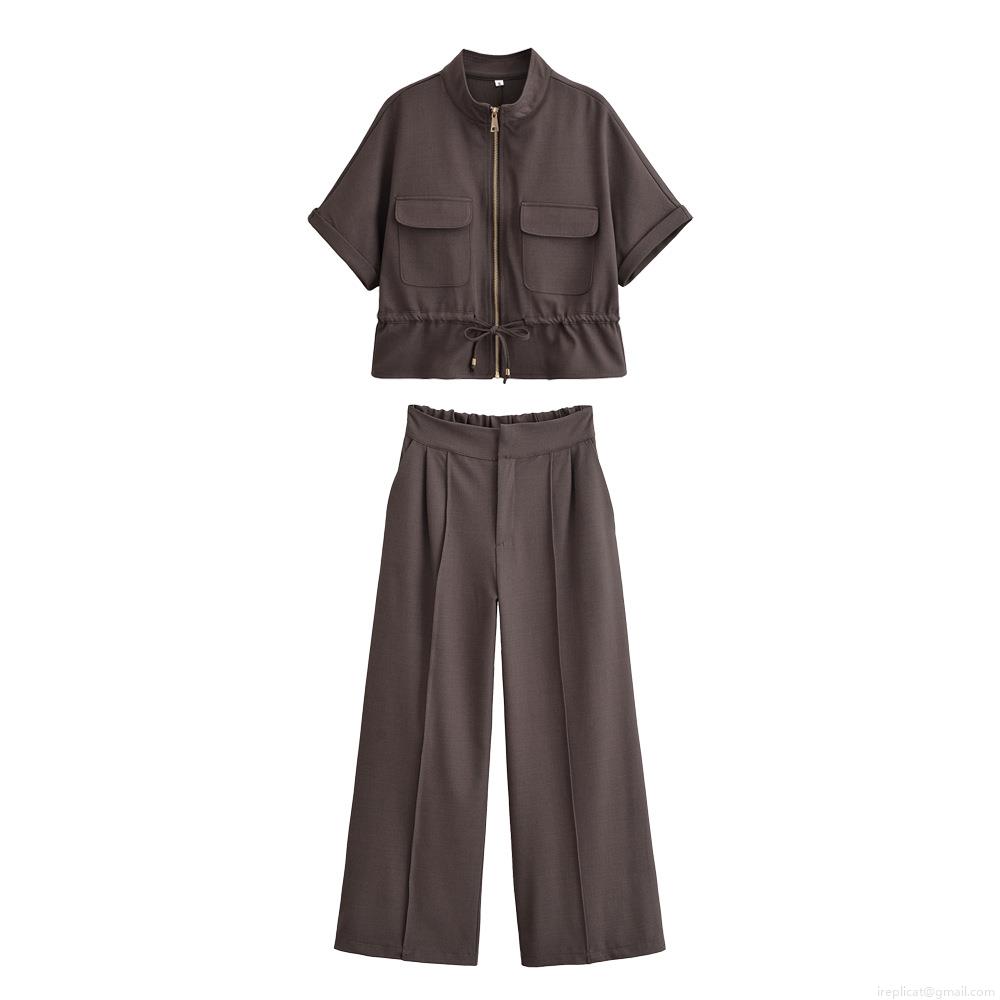 • Women's Casual Two Piece Set 100% Polyester Stand Collar Zipper Short Sleeve Top And High Waist Wide Leg Pants Suit For Street Daily Chic Women