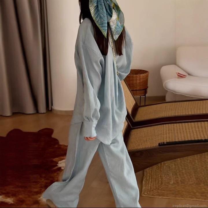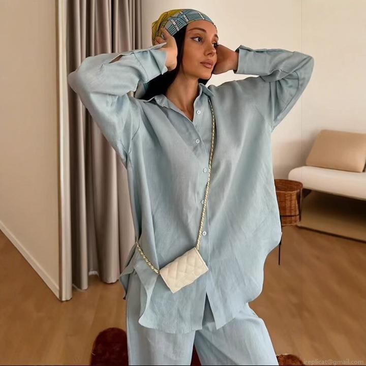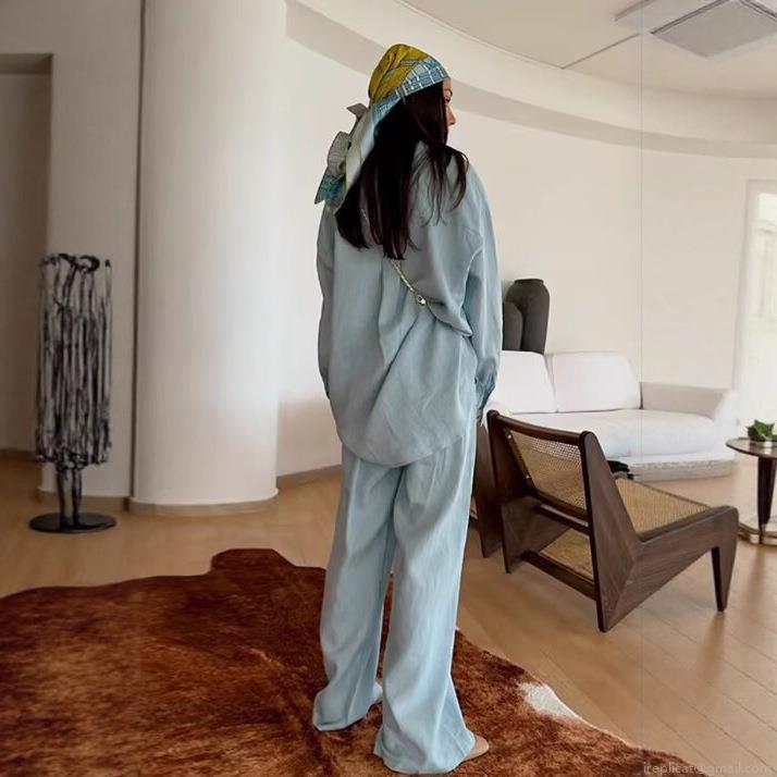 • Women's Casual Two Piece Set Long Sleeve Loose Shirt And Elastic Waist Wide Leg Pants Solid Color Soft Linen-Like Polyester Loungewear Outfits