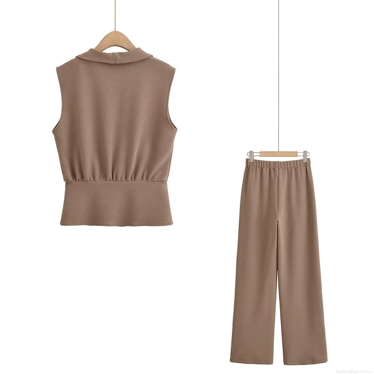 • Women's Casual Two Piece Set Sleeveless V-Neck Top And High Waist Wide Leg Pants Solid Textured Polyester Crepe Outfits For Women