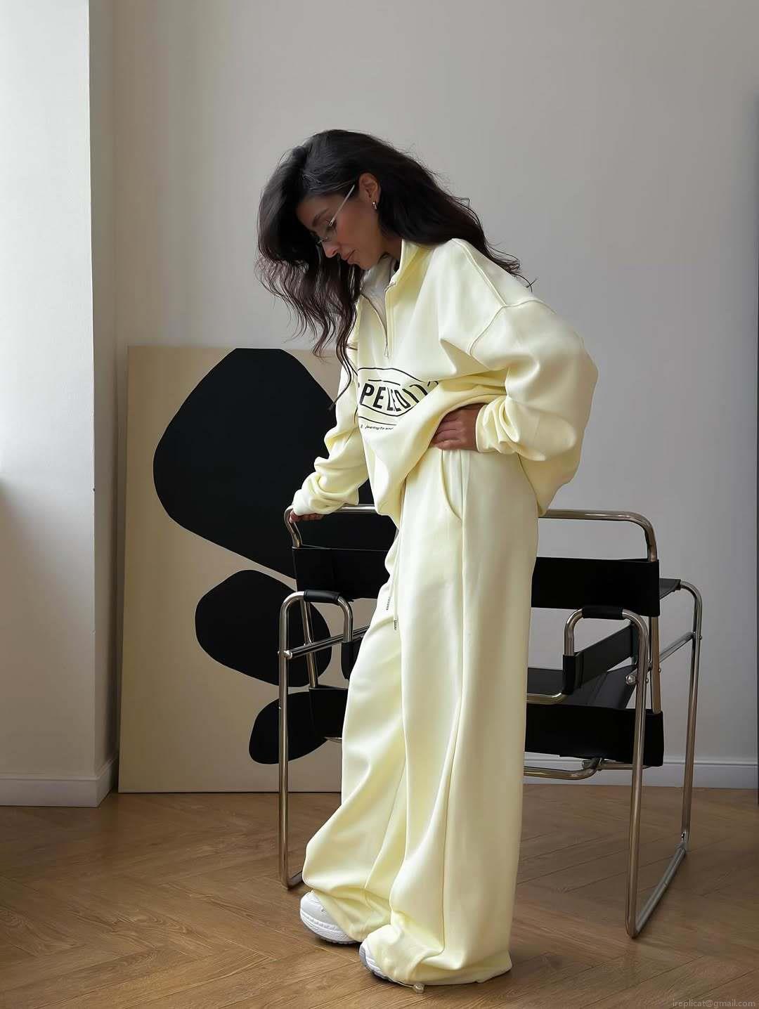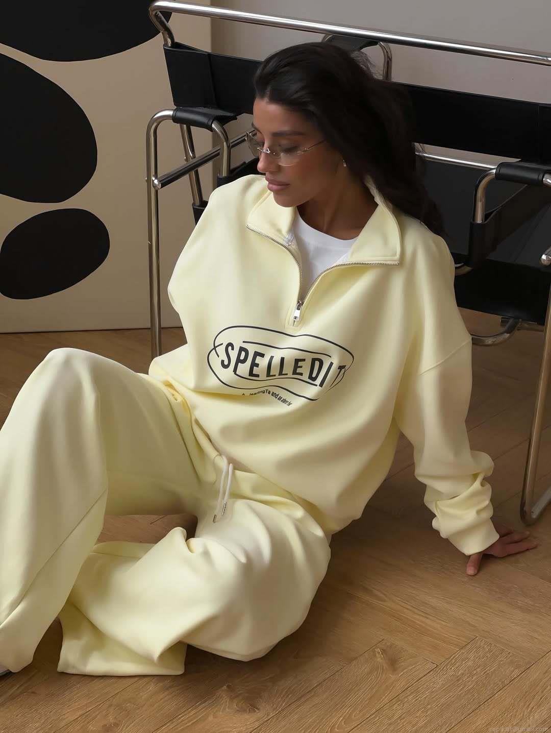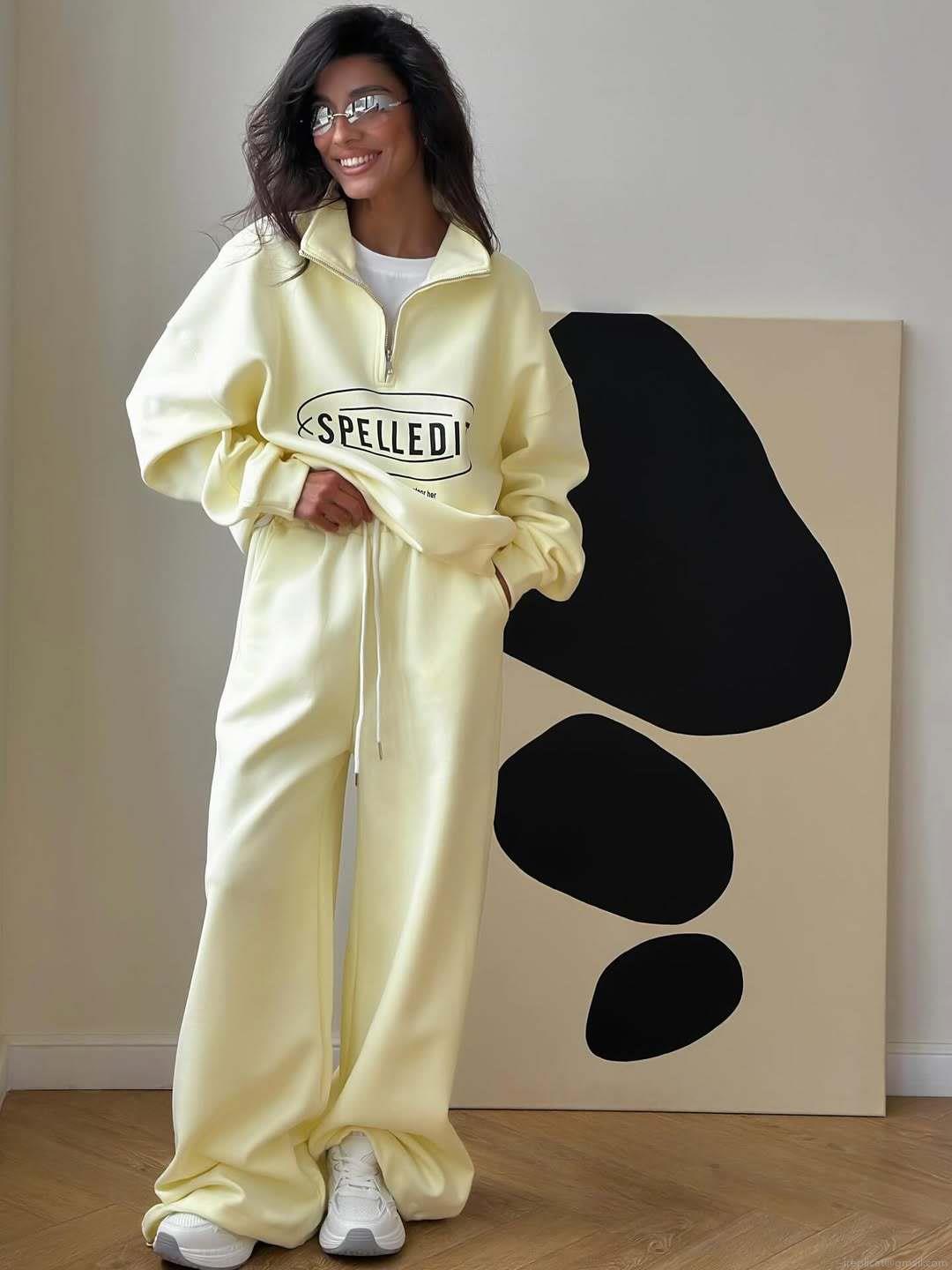 Text, Letters, Color Blocking, Half Zipper, Printing, Straight Tube, Wide-leg