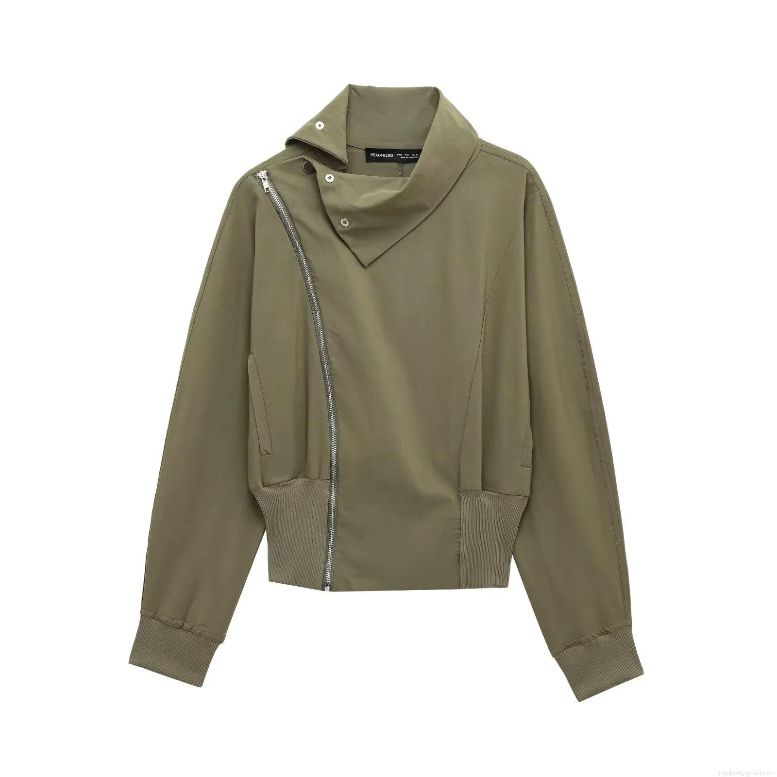 Women's Casual Two-Piece Cargo Set Olive Green Stand Collar Asymmetric Zipper Jacket and High Waist Wide Leg Cargo Pants Streetwear Outfit