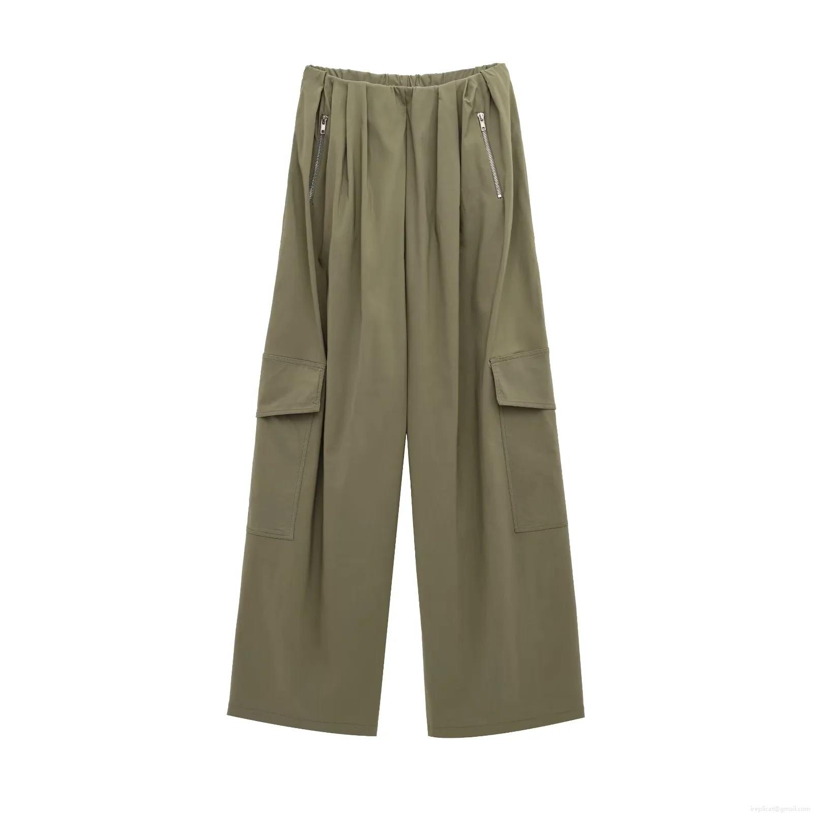 • Women's Casual Two-Piece Cargo Set Olive Green Stand Collar Asymmetric Zipper Jacket and High Waist Wide Leg Cargo Pants Streetwear Outfit