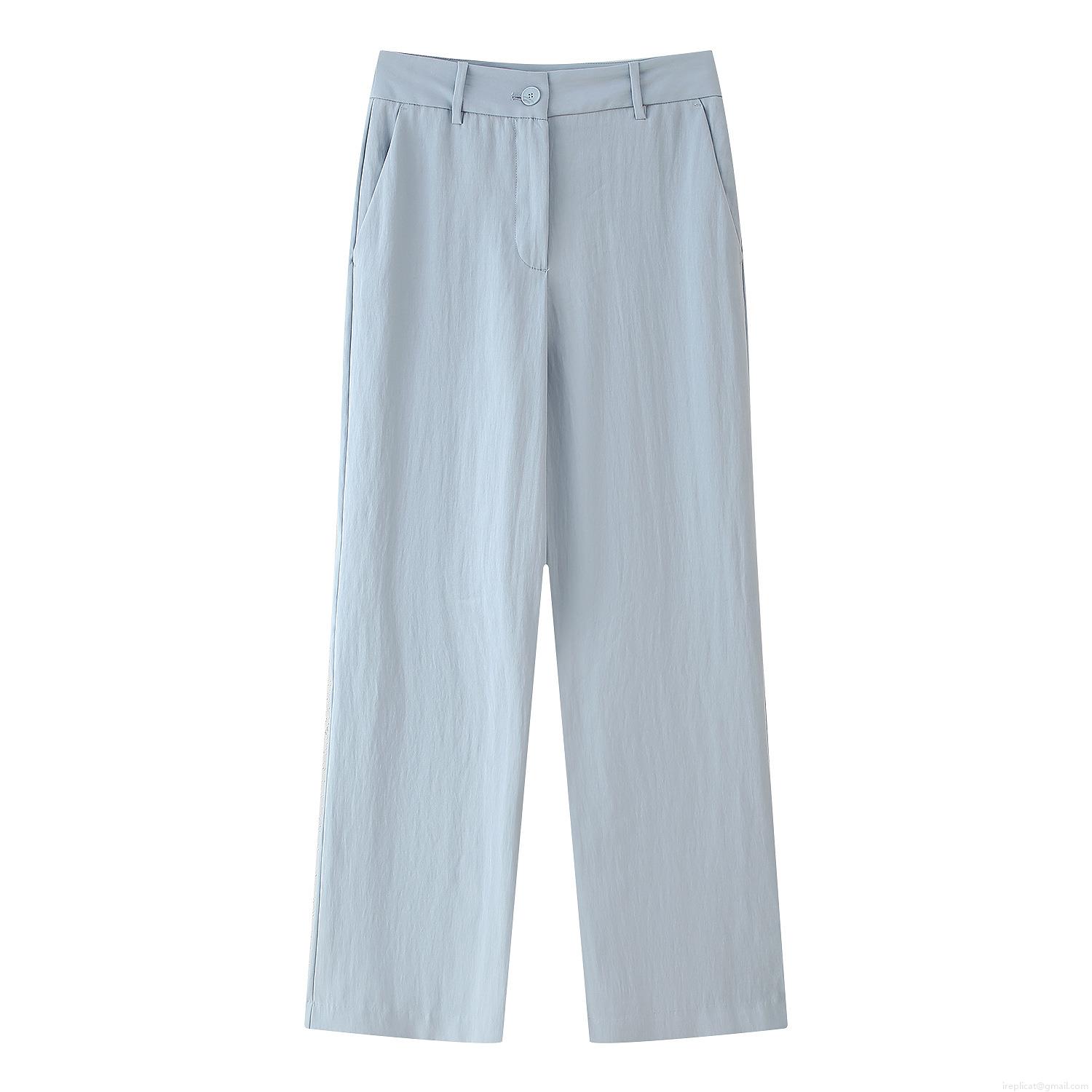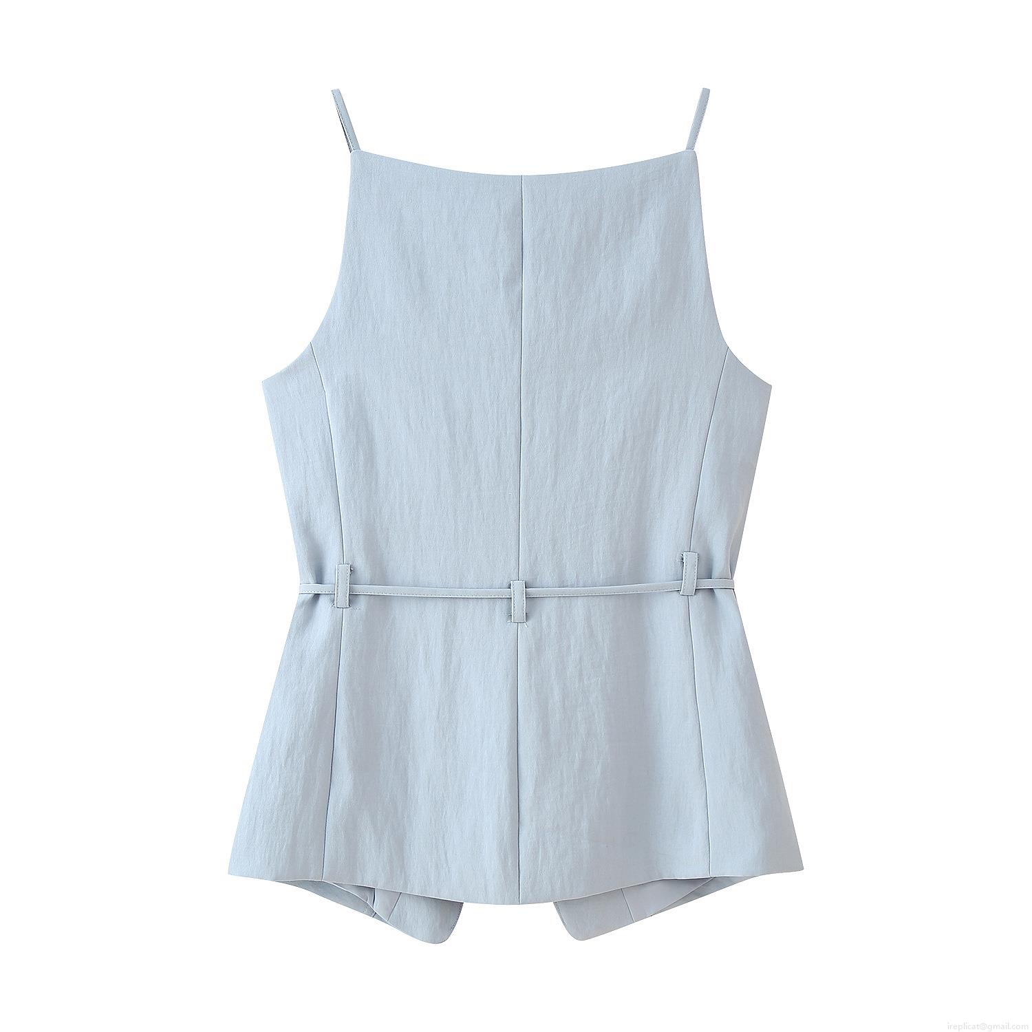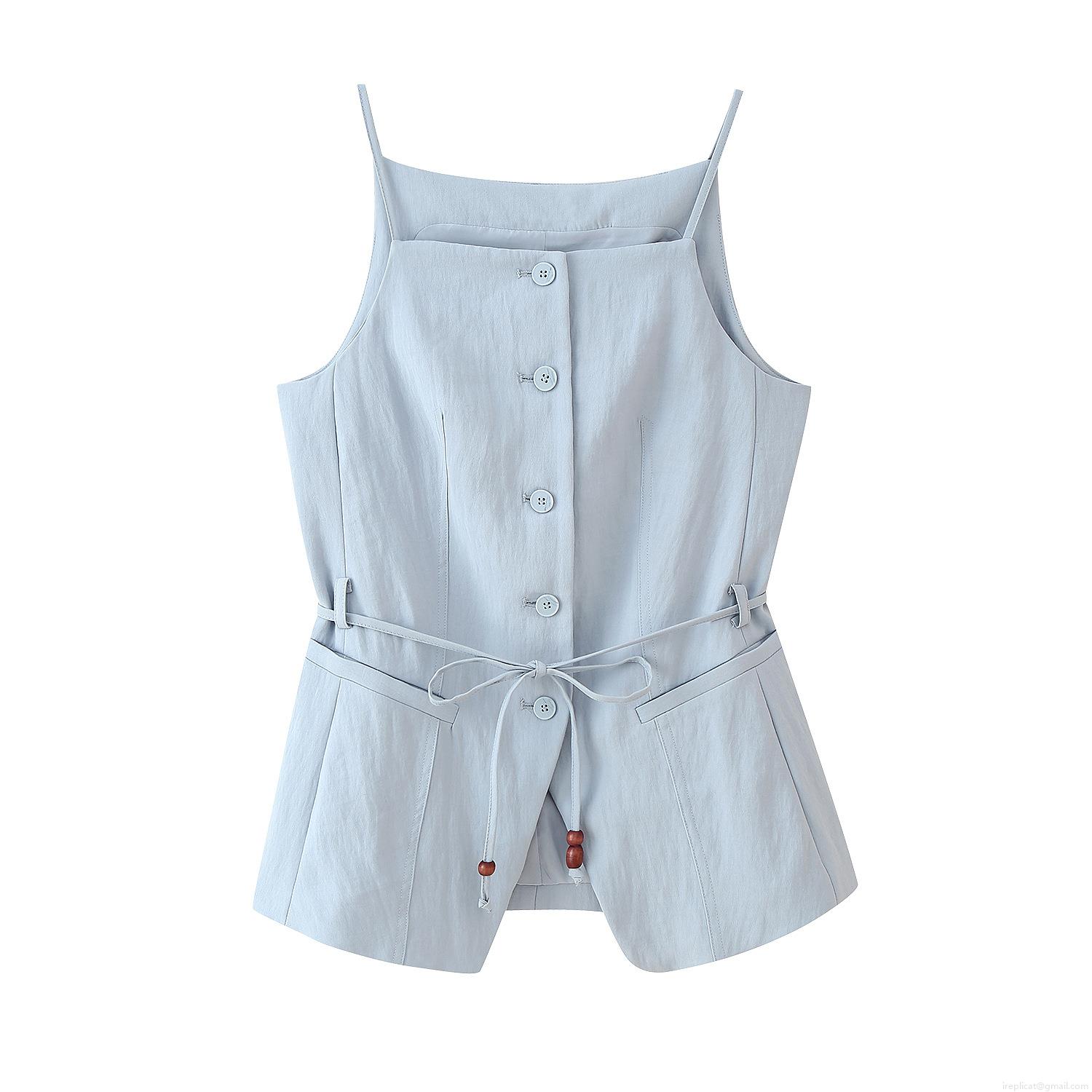 • Women's Casual Two-Piece Set Light Blue Camisole Vest With Beaded Waist Belt And High Waist Straight Leg Pants Sleeveless Summer Streetwear Outfit