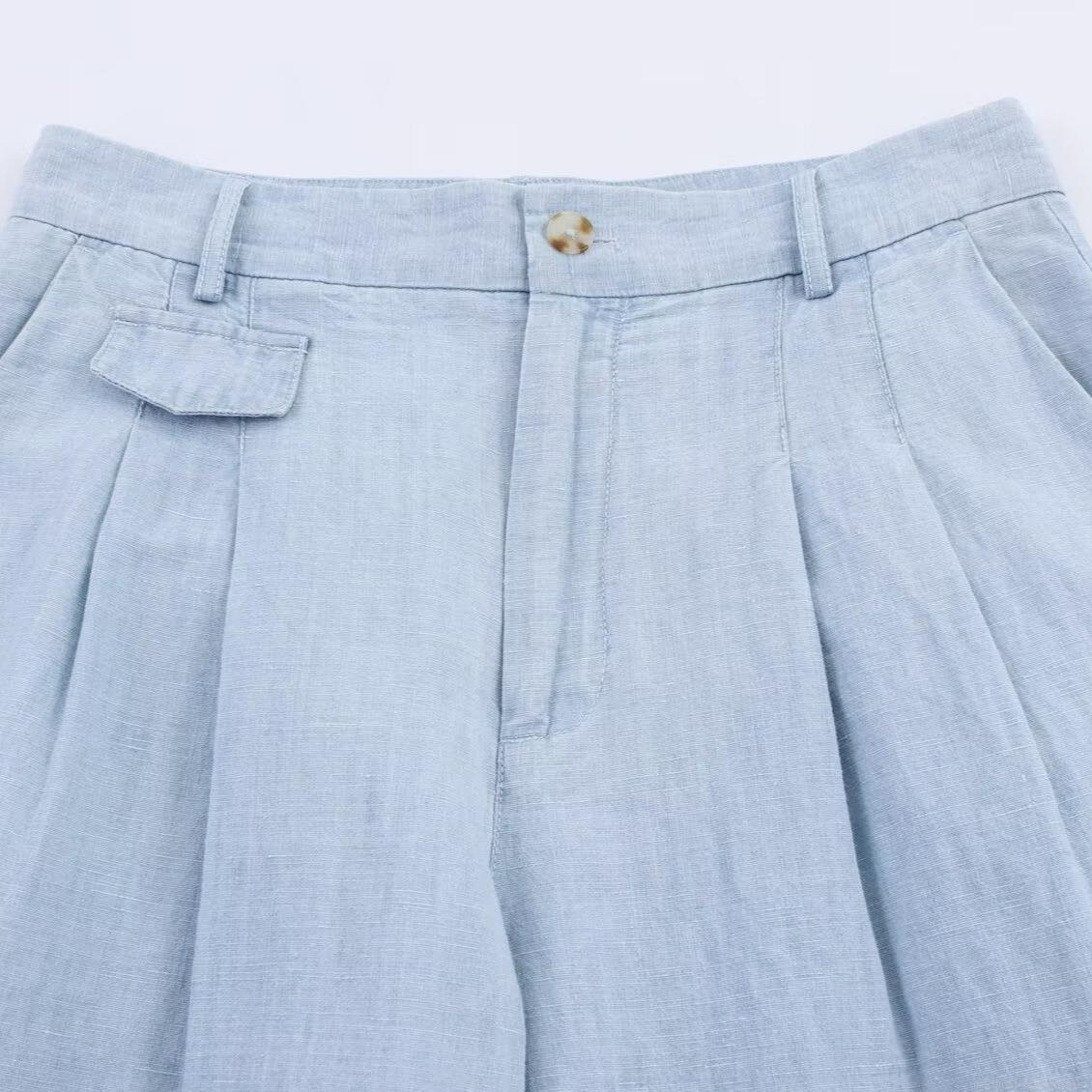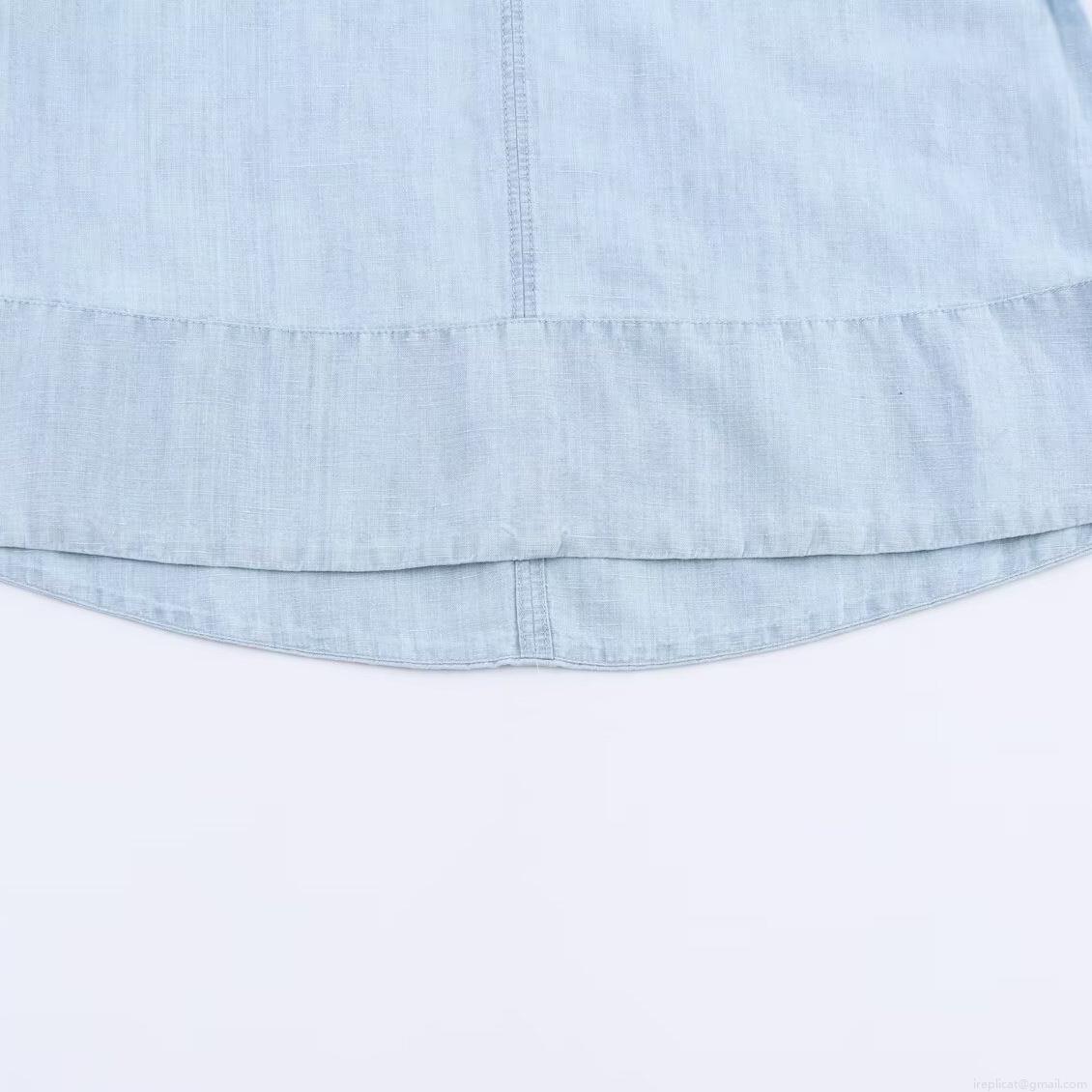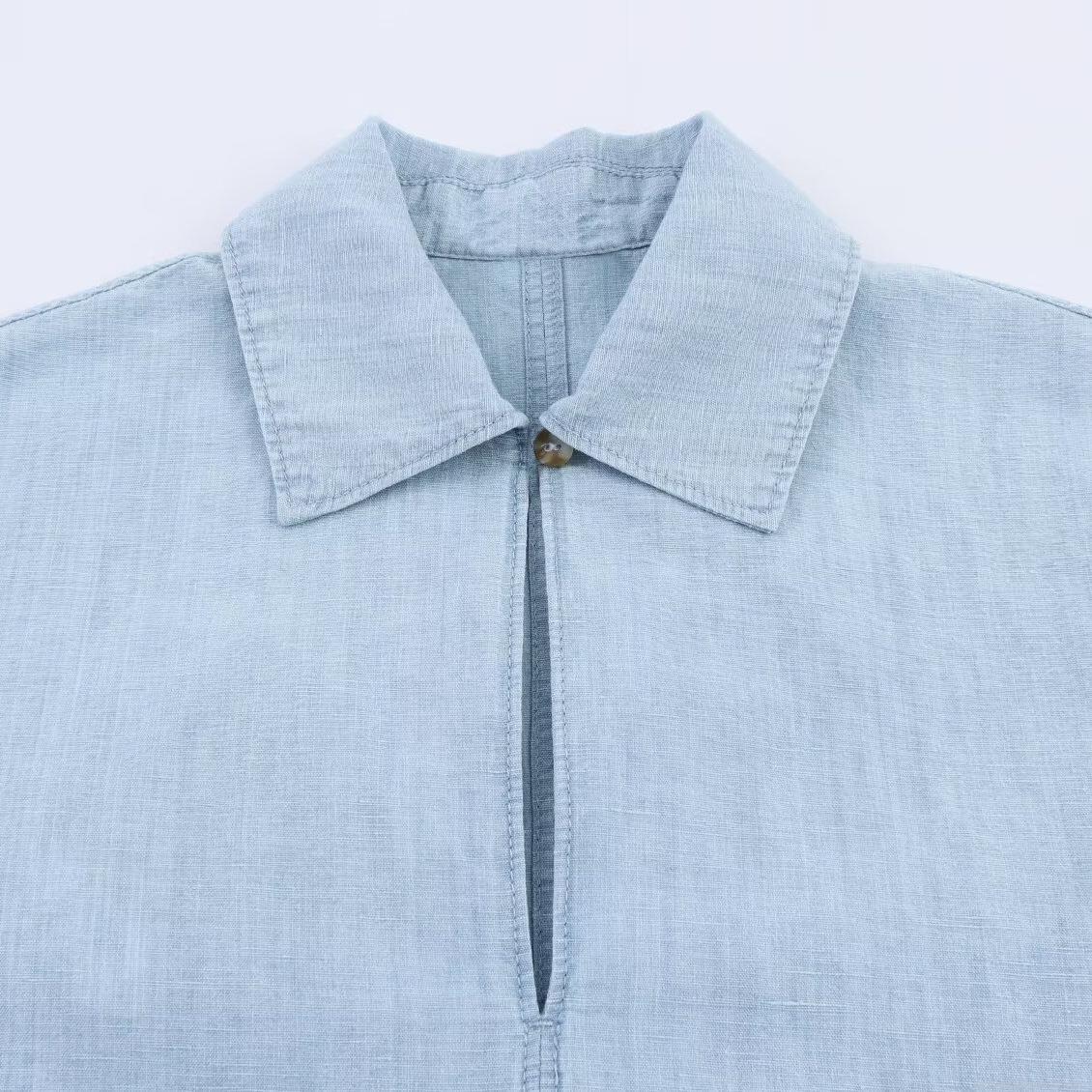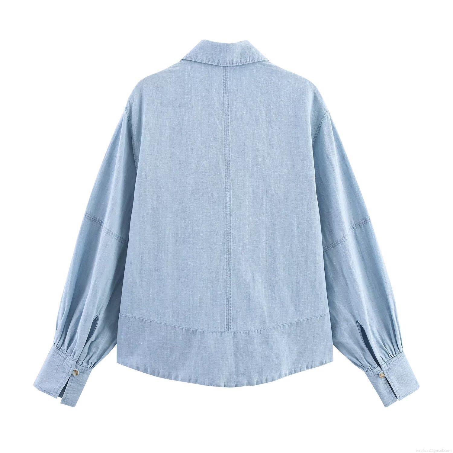 • Women's Casual Washed Denim Set Light Blue Long Sleeve Stand Collar Shirt and High Waist Wide Leg Straight Pants Two Piece Outfit For Women
