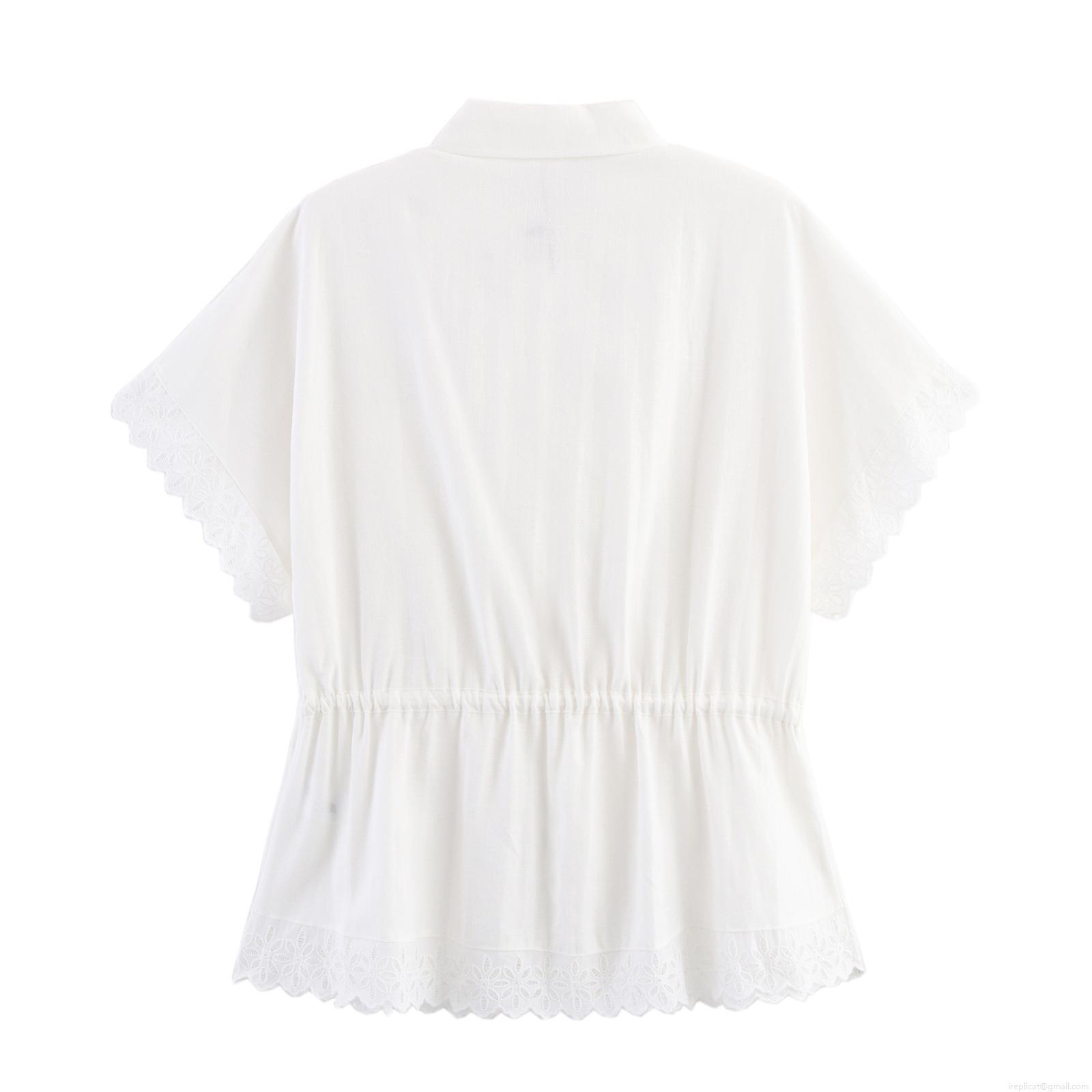 Women's Casual White Cotton Polyester Blend Set Short Sleeve Lace Trim Shirt and Straight Leg Pants Two Piece Outfit Summer Comfort Loungewear