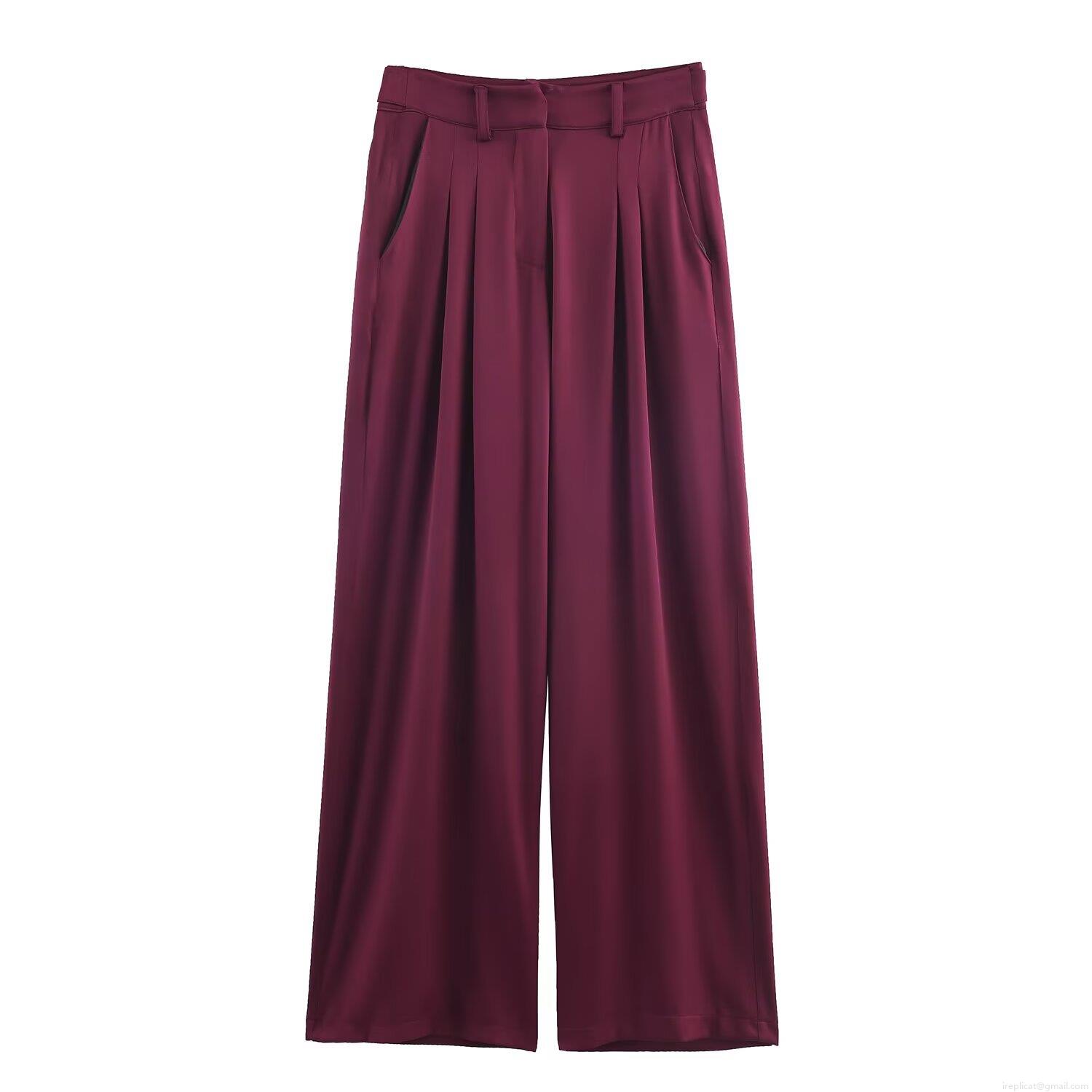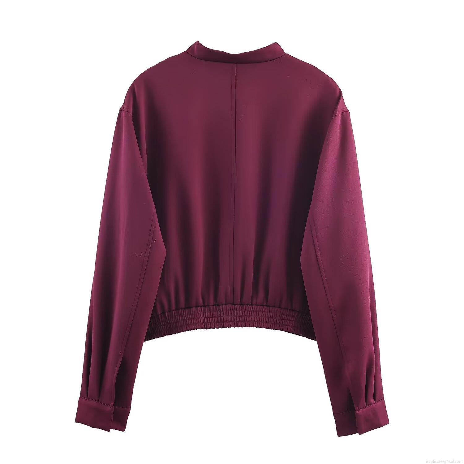 • Women's Casual Wine Red Two Piece Set Solid Short Bomber Jacket and High Waist Wide Leg Pants Streetwear Outfits