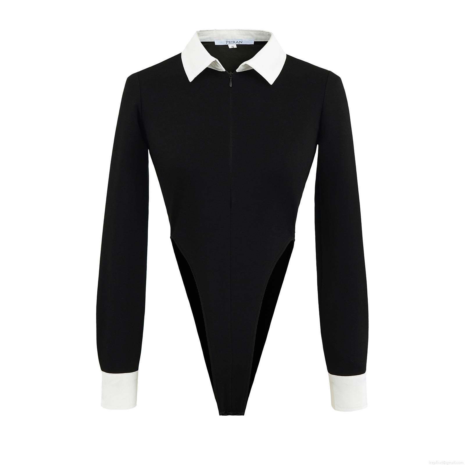 • Women's Contrast Color Two Piece Set Lapel Long Sleeve Zipper Bodysuit and High Waist Straight Leg Pants with Metal Buckle Casual Streetwear Suits