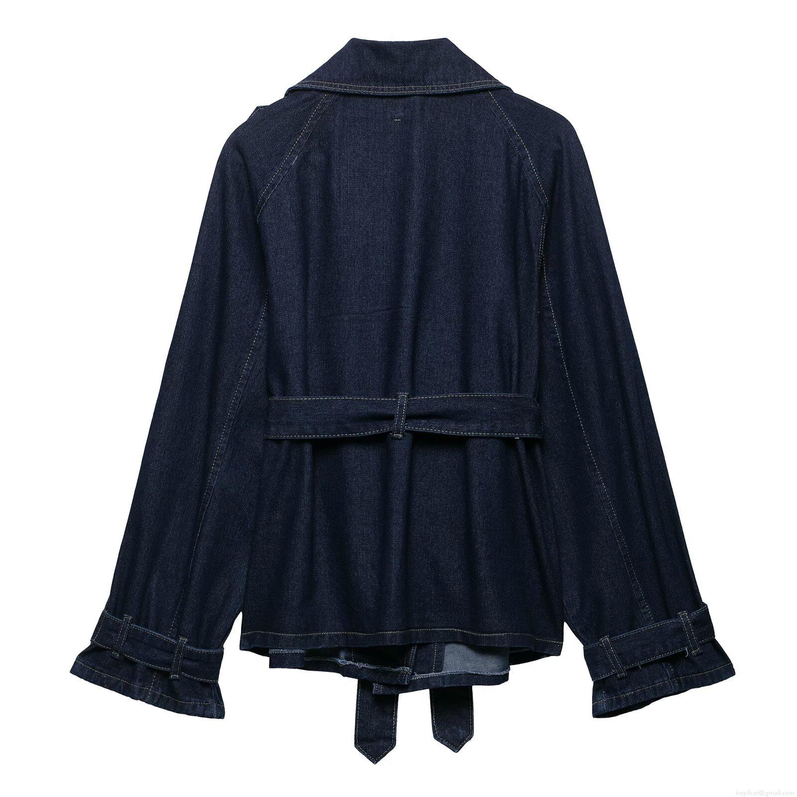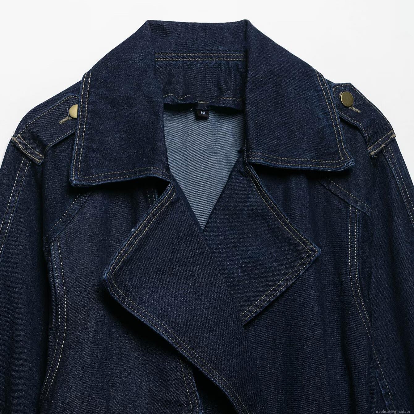 Women's Dark Blue Denim Style Two-Piece Set Belted Trench Coat And Wide Leg Pants Casual Fashion Summer Outfit For Women