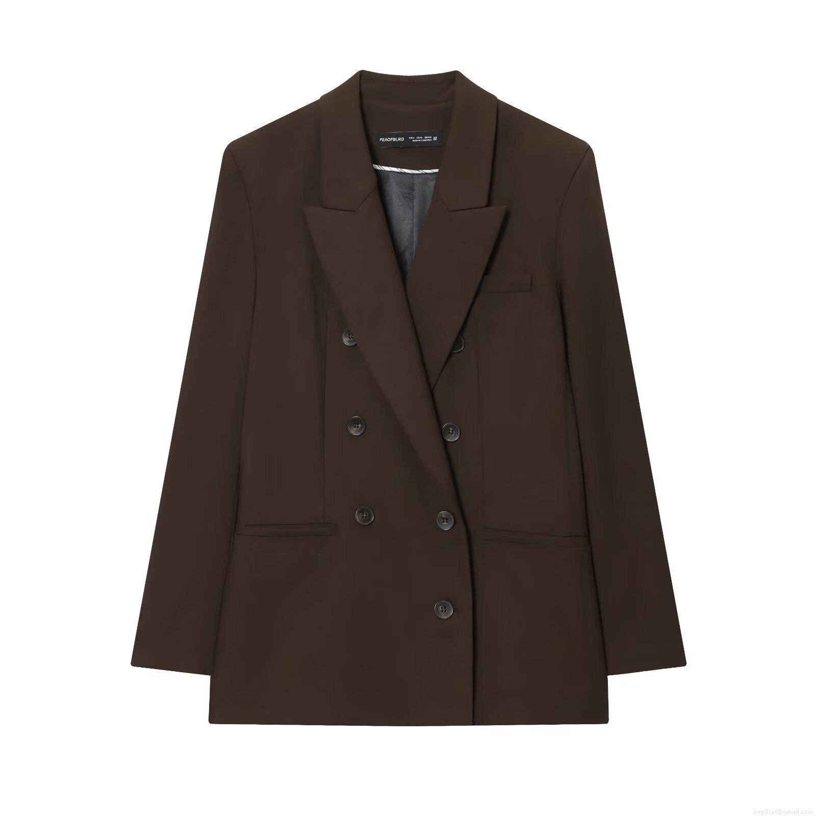 Women's Dark Brown Business Casual Suit Set Double-Breasted Padded Shoulder Blazer and High Waist Straight Wide Leg Pants Elegant Two Piece Set