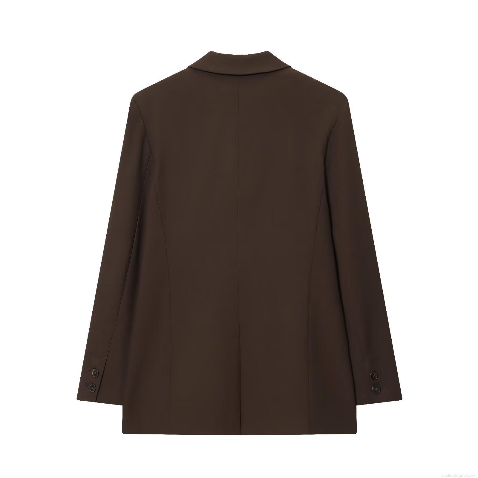 • Women's Dark Brown Business Casual Suit Set Double-Breasted Padded Shoulder Blazer and High Waist Straight Wide Leg Pants Elegant Two Piece Set