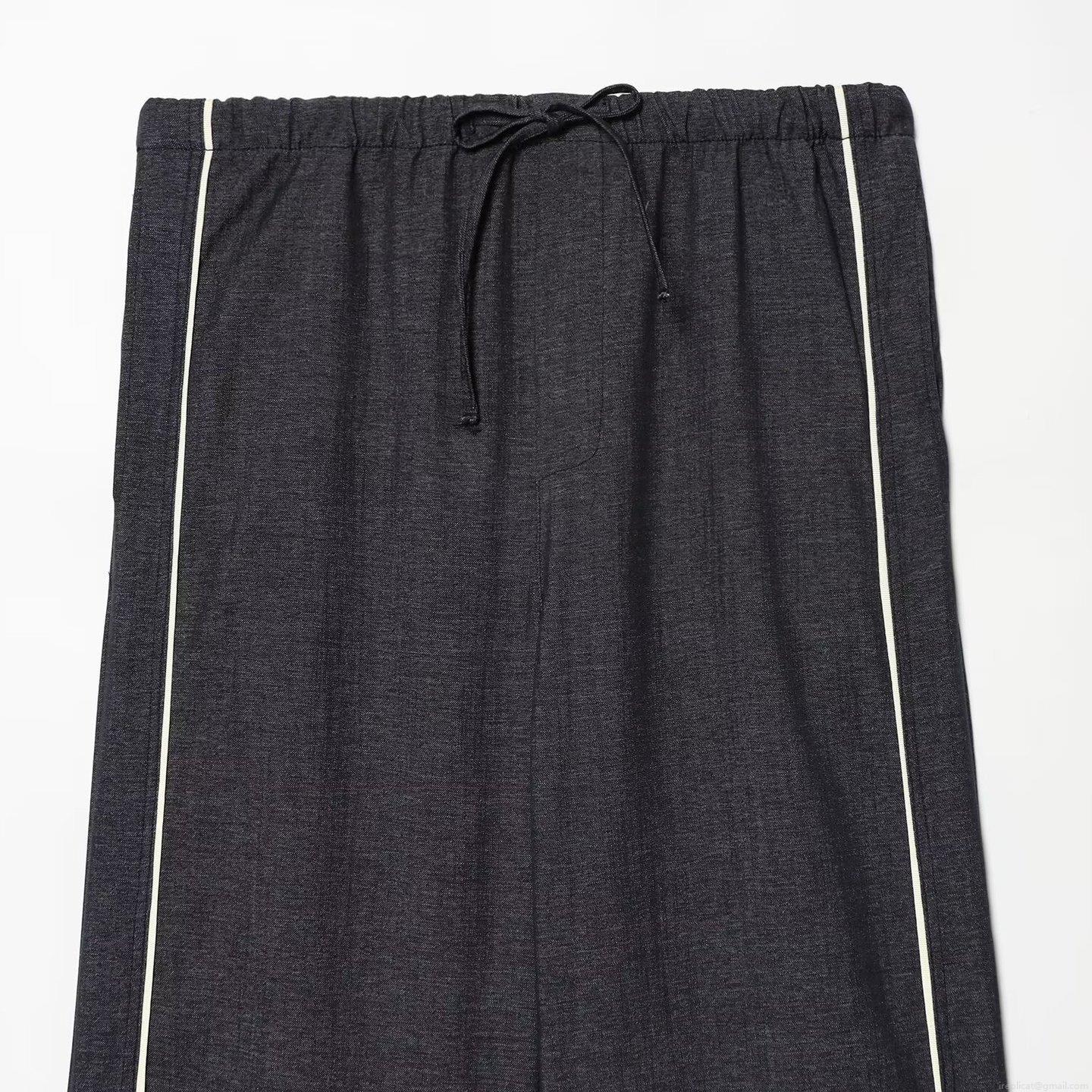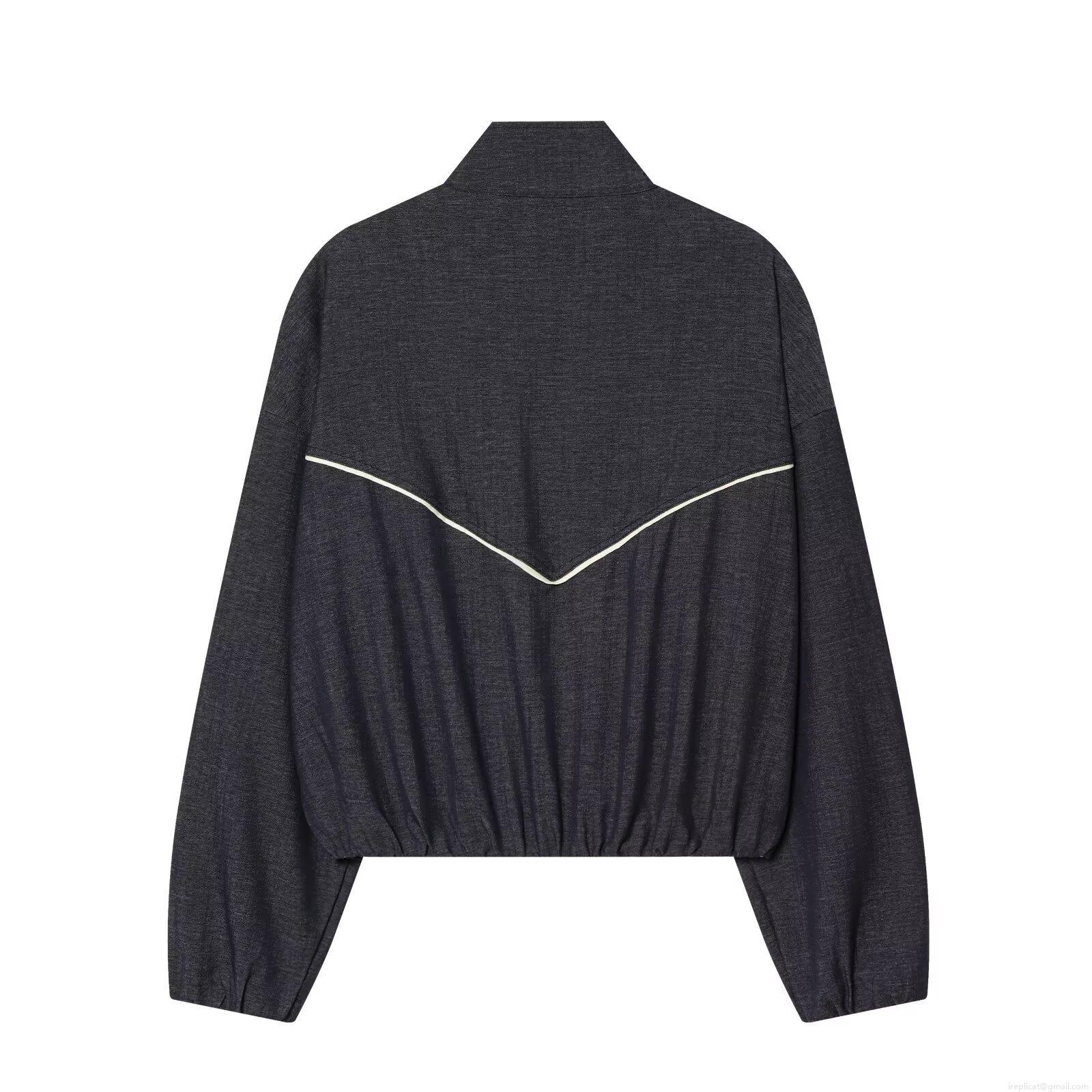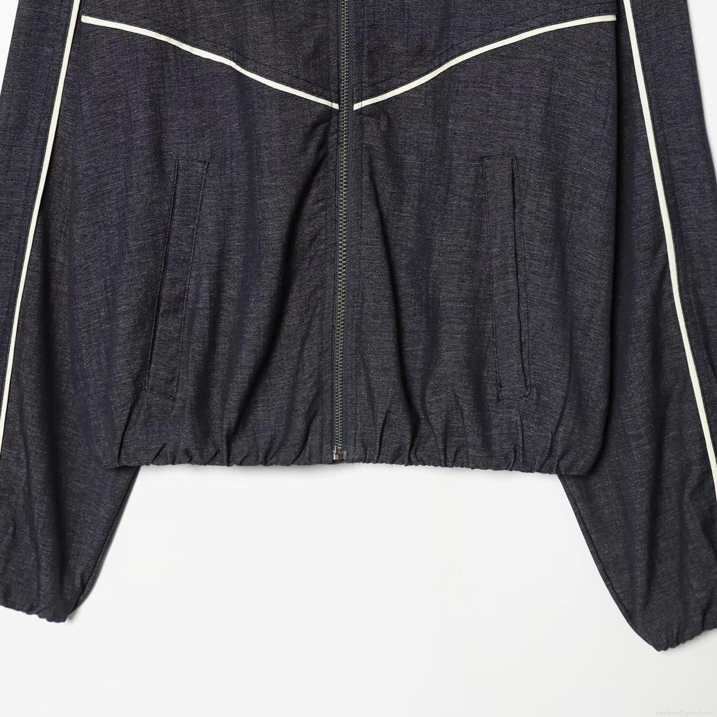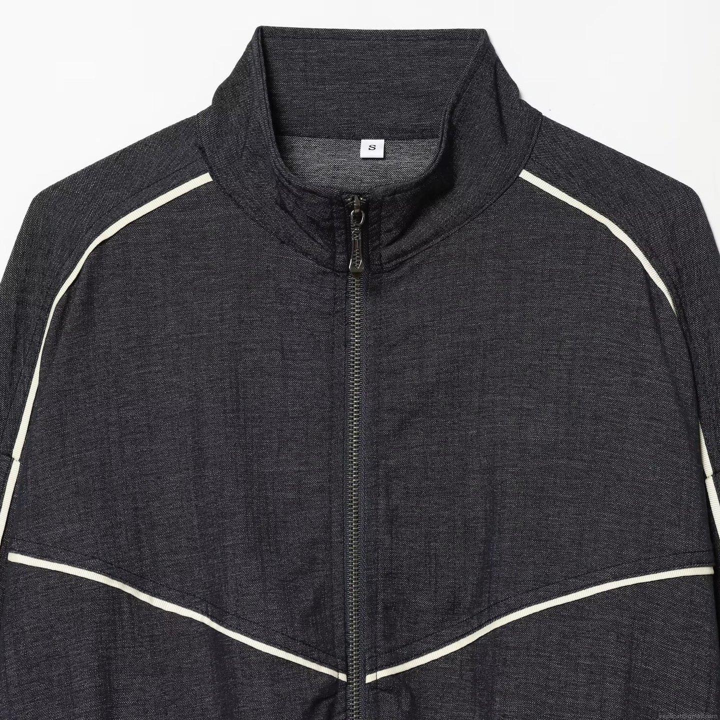 • Women's Dark Grey Denim Jacket Or Wide Leg Pants Set Fashion Loose Stand Collar Zip Up Top White Striped Casual Sporty Trousers Streetwear