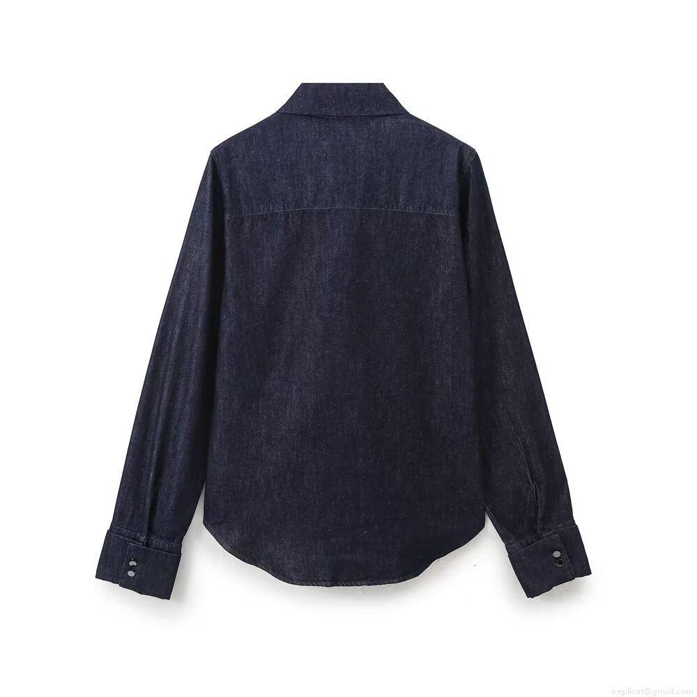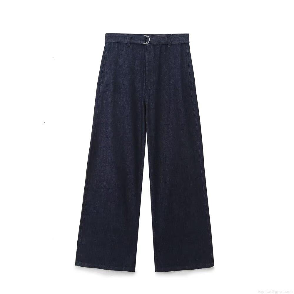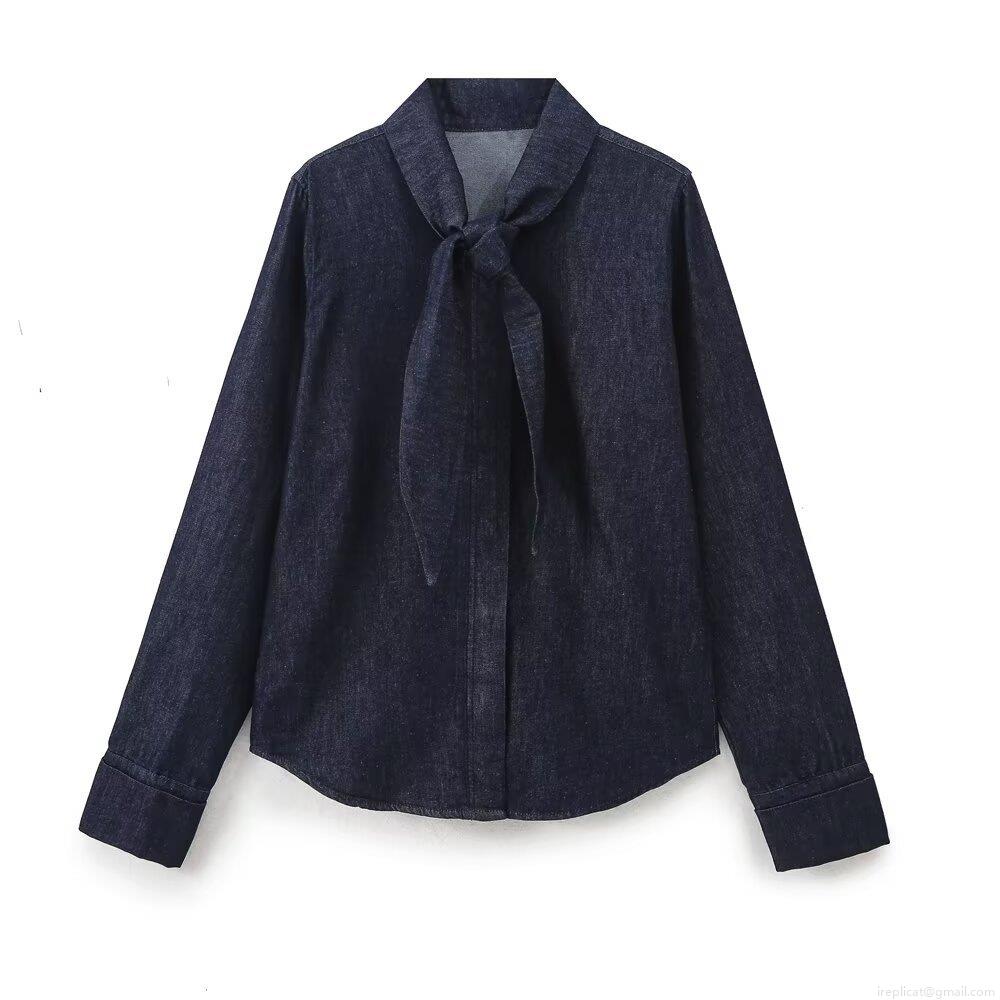 • Women's Denim Casual Suit Bow Tie Long Sleeve Shirt and Wide Leg Pants Two Piece Set with Belt Dark Blue Fashion Streetwear Outfit for Women