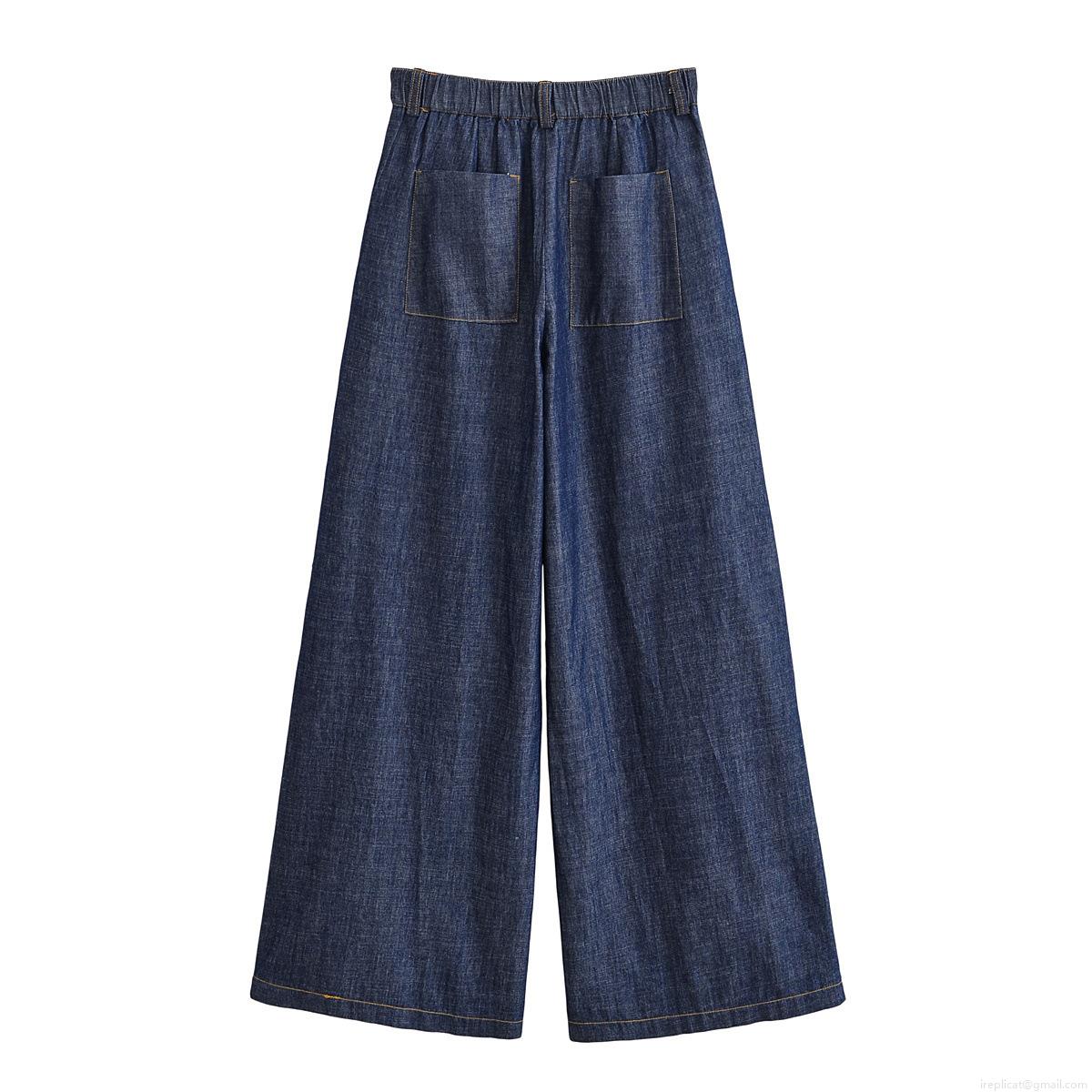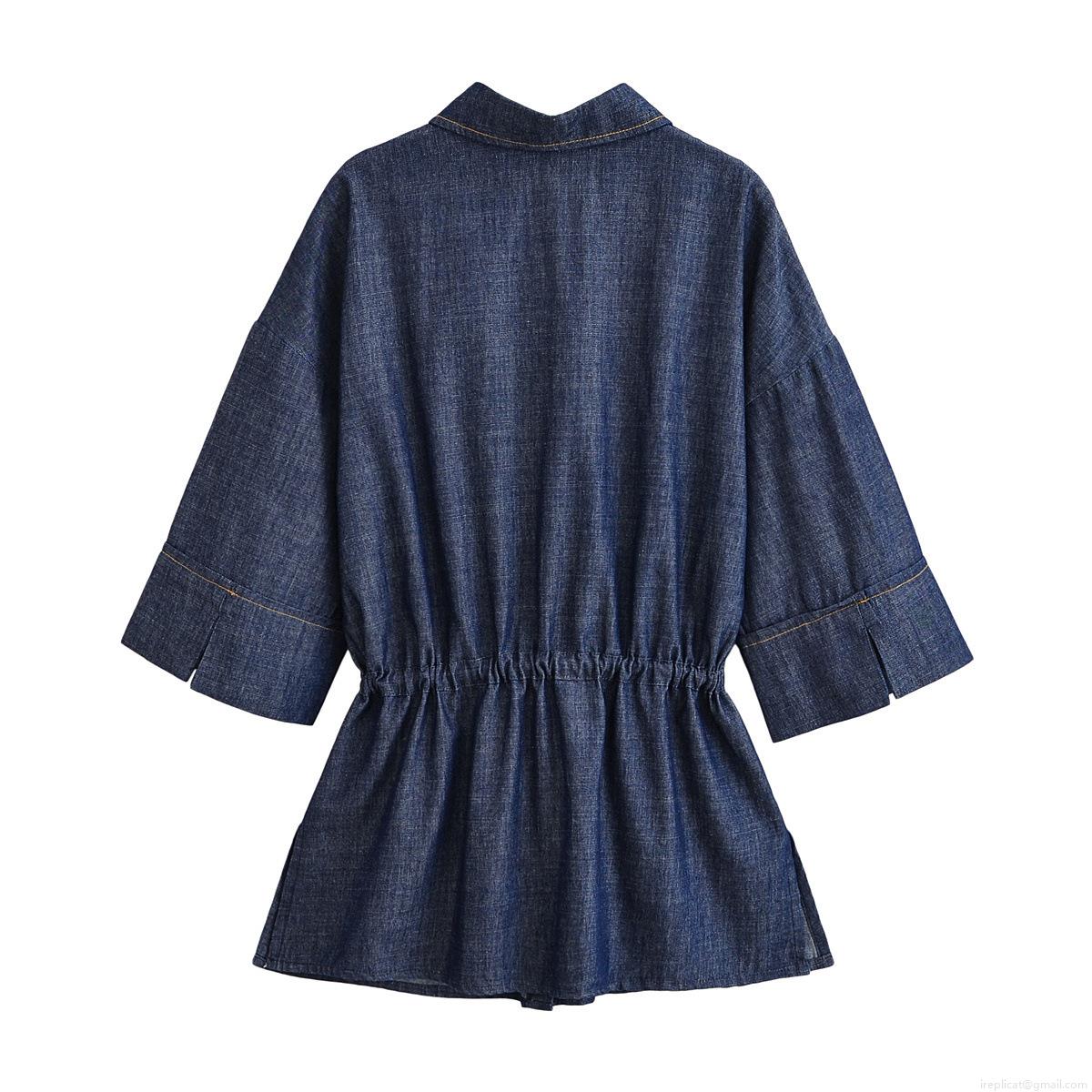Women's Denim Style Safari Shirt And Pants Two Piece Set Deep Blue Polyester Outfits With Drawstring Waist Long Wide Leg Trousers Casual Streetwear Suits