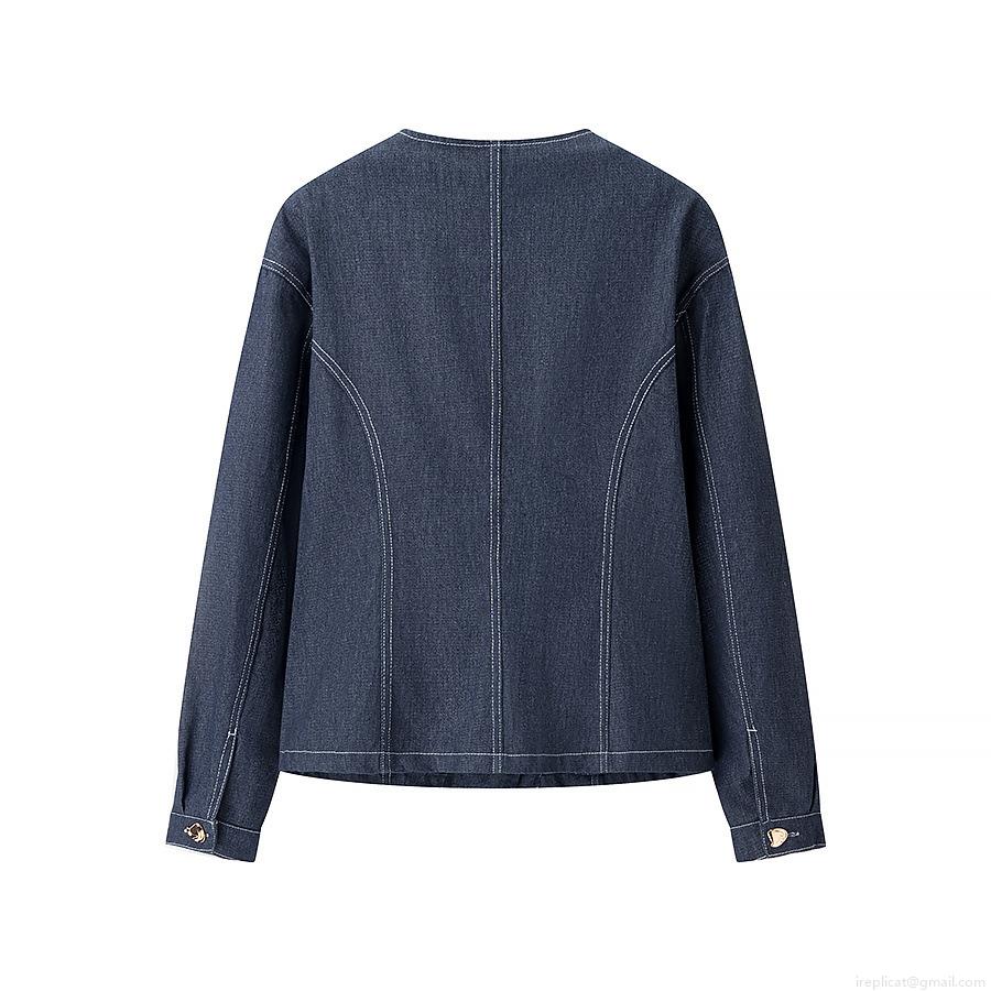 Women's Denim Style Two-Piece Set Solid Color Round Neck Long Sleeve Jacket and High Waist Wide Leg Pants Set with White Contrast Stitching and Gold Buttons Streetwear Casual Outfits
