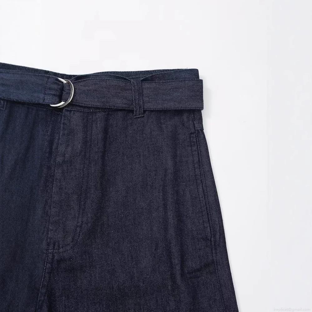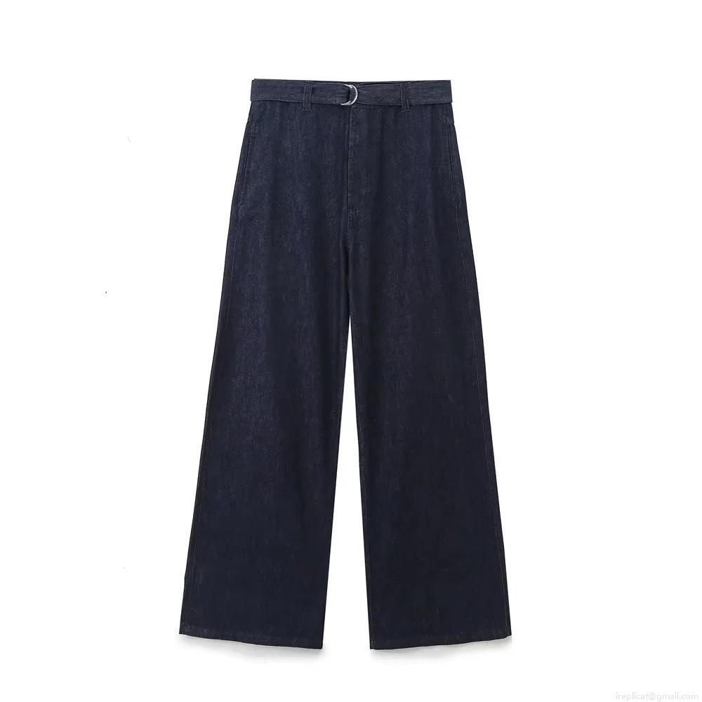 Solid Color, Bow Tie, Denim Texture, High-waisted Design, Wide-leg Pants, Metal D-ring Belt