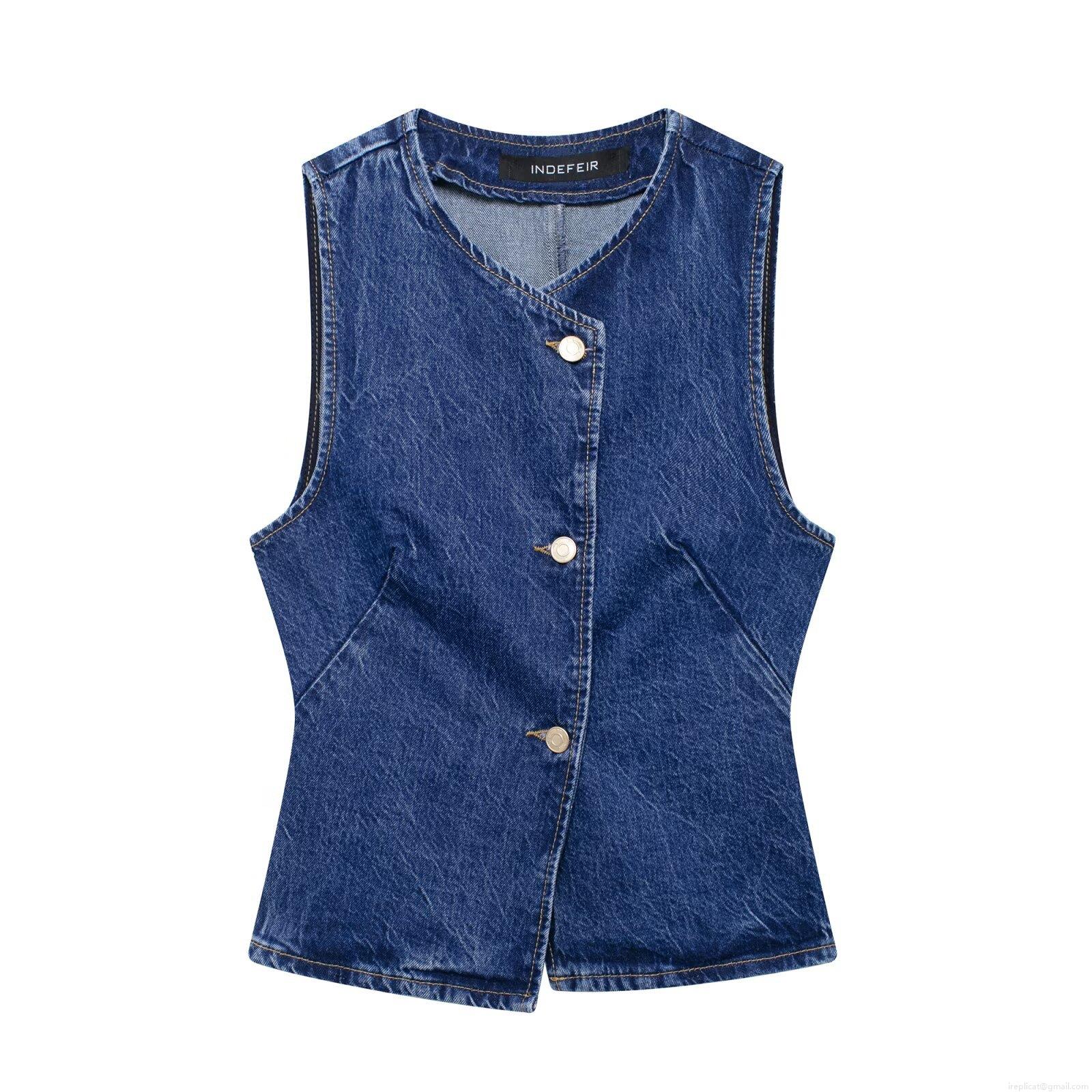 • Women's Denim Two Piece Set Sleeveless V Neck Vest And High Waisted Wide Leg Jeans With Belt Metal Chain Casual Streetwear Outfit For Ladies