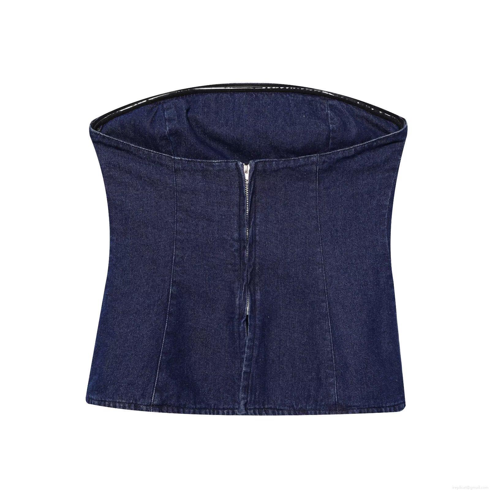 • Women's Denim Two Piece Set Strapless Tube Top And High Waist Wide Leg Long Pants Streetwear Casual Washed Navy Blue Fashion Outfit For Women