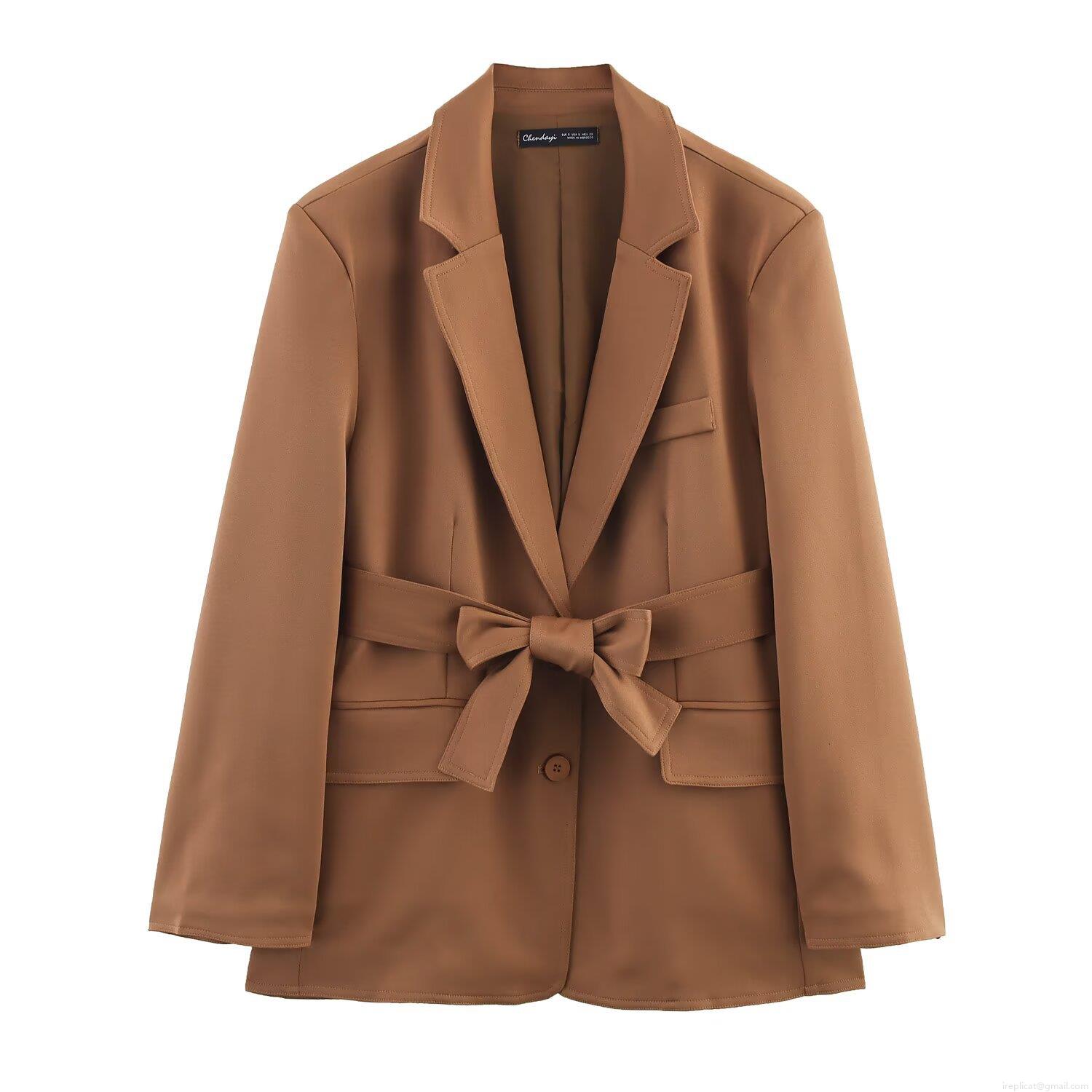 • Women's Elegant 2 Piece Blazer Suit Set Oversized Lapel Jacket With Bow Belt And High Waist Wide Leg Pleated Trousers Solid Color Casual Office Streetwear Outfits