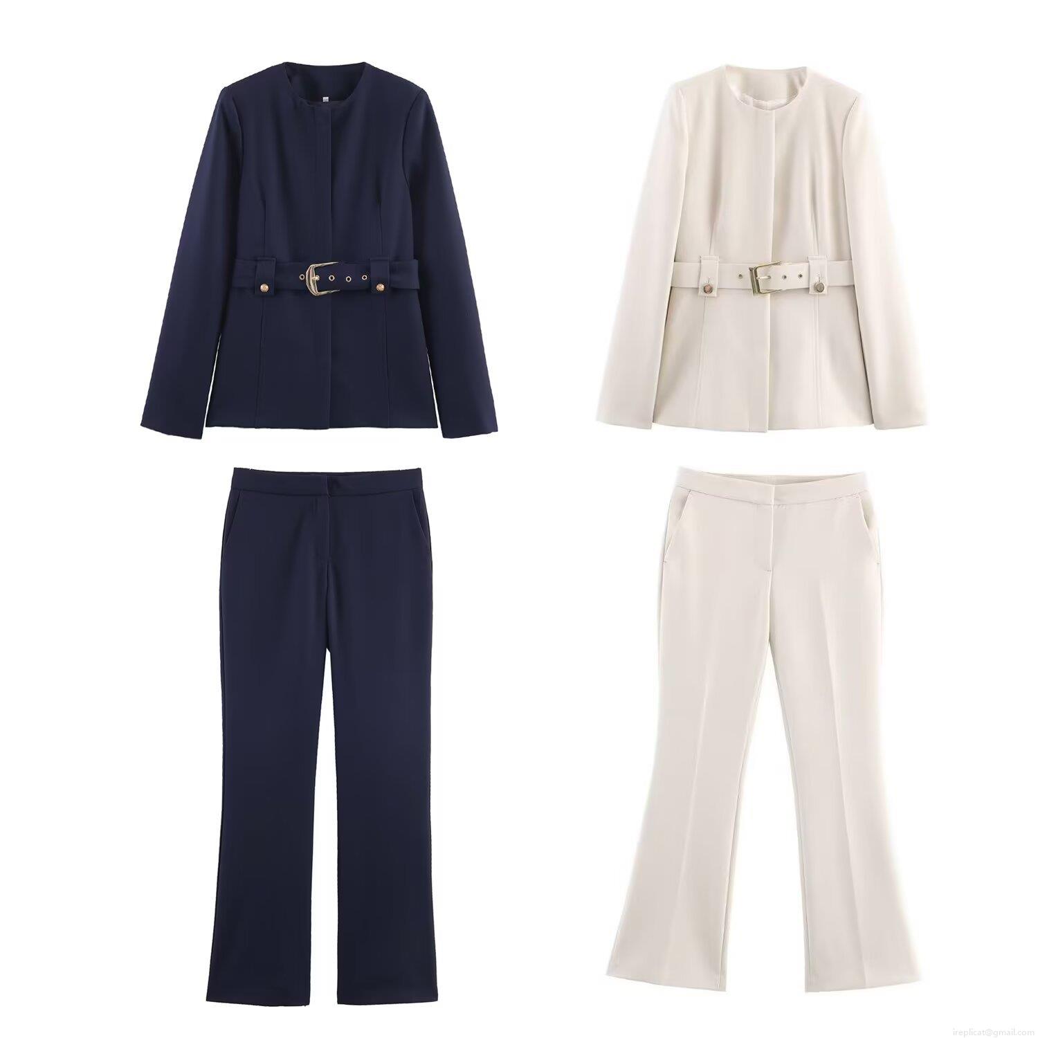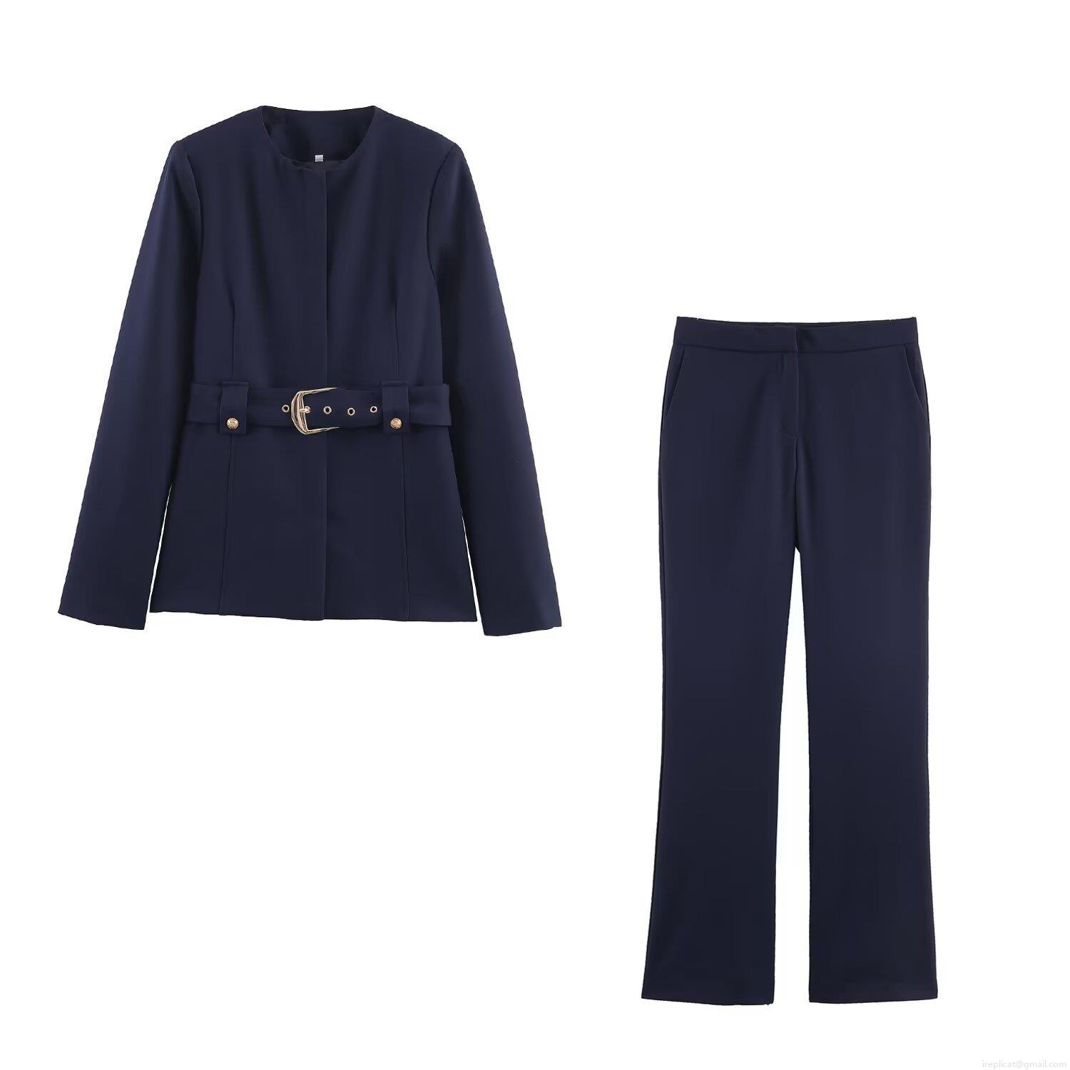 • Women's Elegant 2 Piece Suit Set Solid Color Polyester Round Neck Blazer With Metal Buckle Belt And Flare Pants Outfits Office Lady Streetwear Workwear Sets