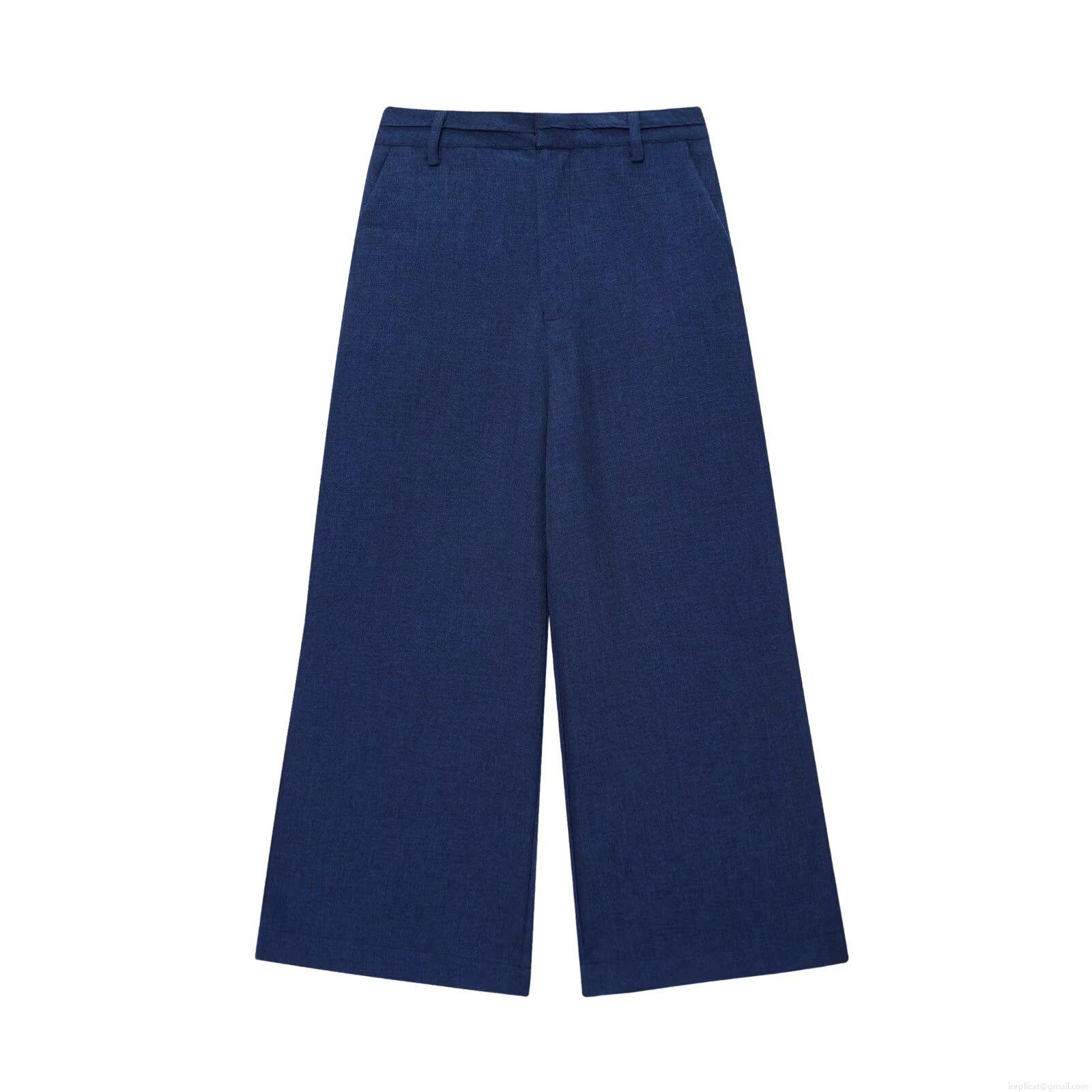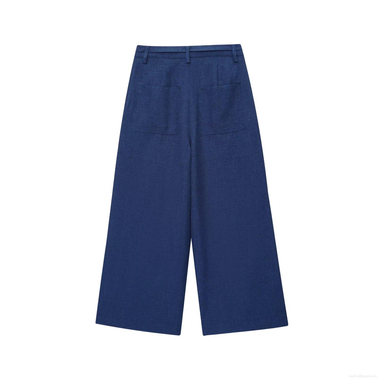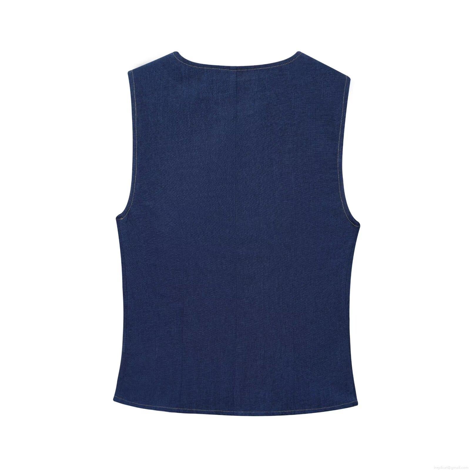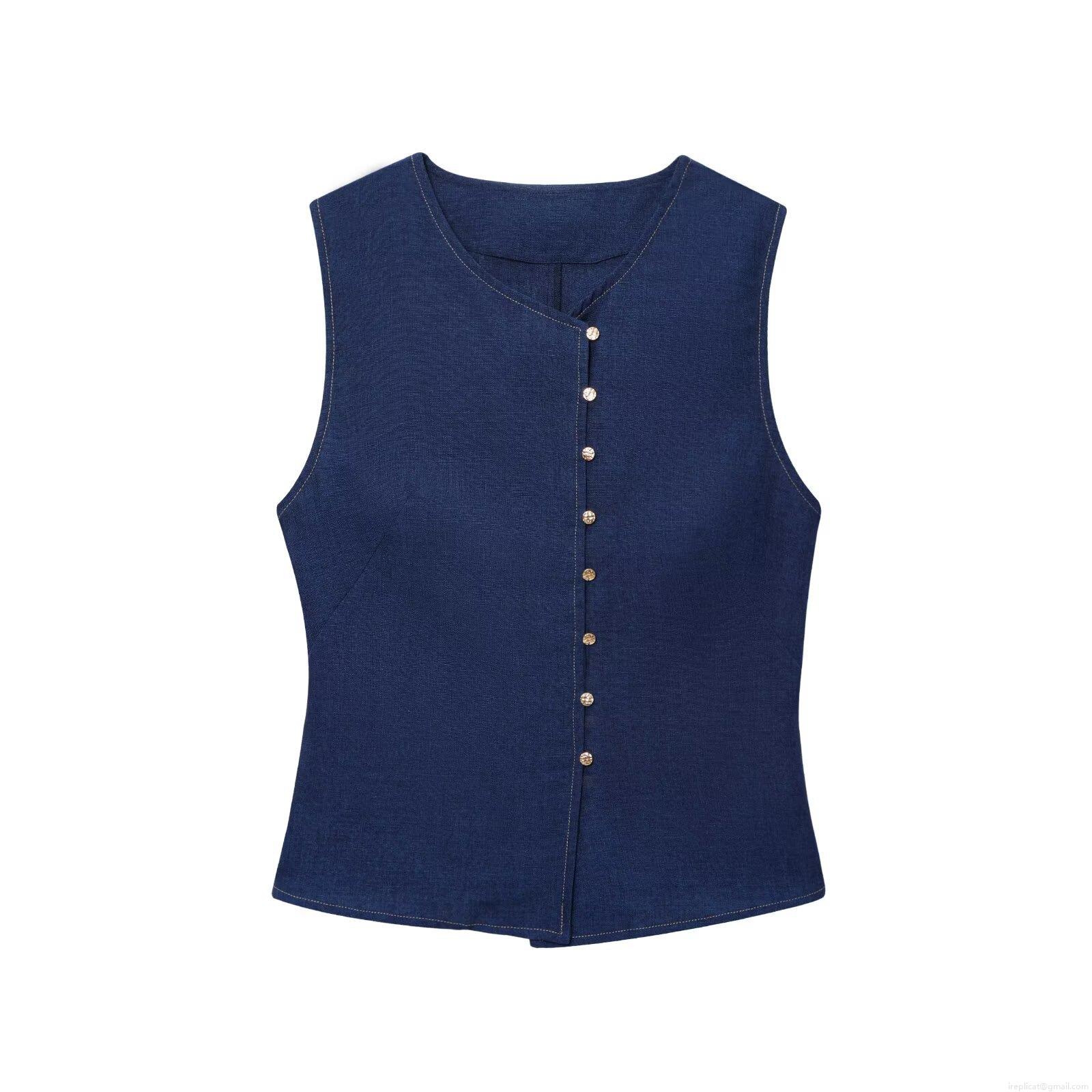 • Women's Elegant Deep Blue Two Piece Set Linen Texture Sleeveless Vest Top With Gold Buttons And Wide Leg Pants Casual Comfortable Summer Outfits