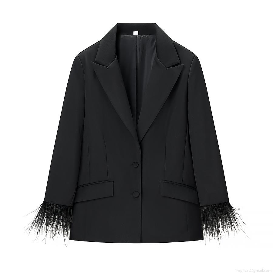 • Women's Elegant Feather Trim Sleeve Blazer And High Waisted Wide Leg Pants Two Piece Set Solid Color Formal Suit For Office Party