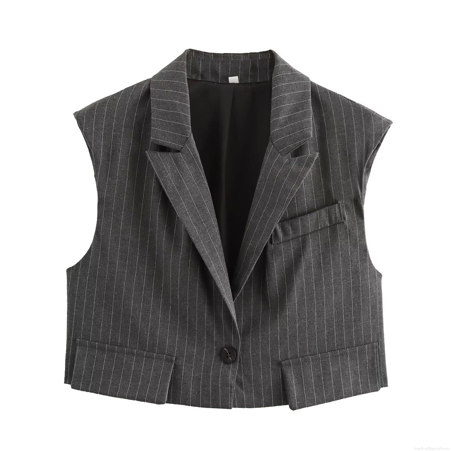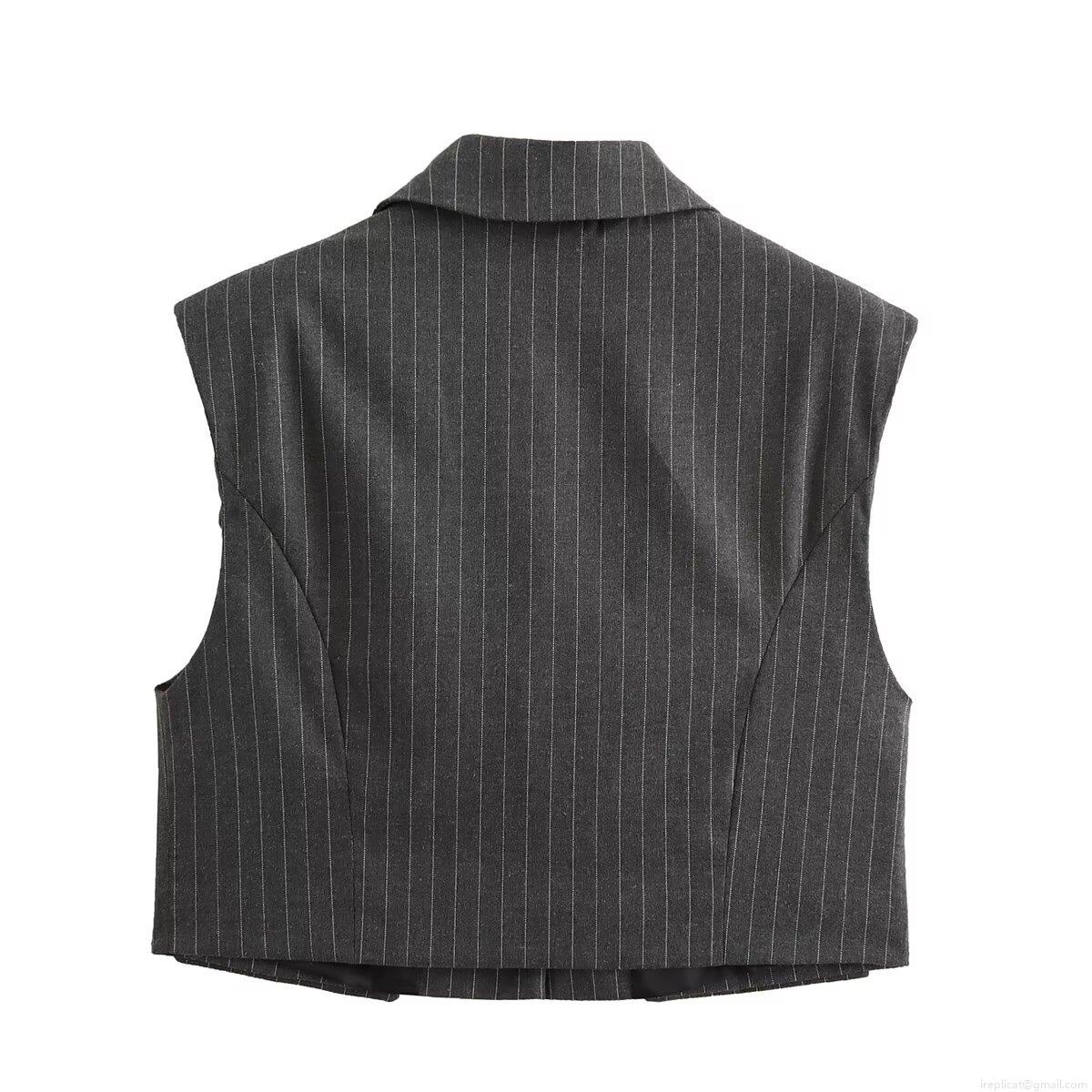 Women's Elegant Grey Pinstripe Vest and Wide Leg Pants Set 100% Polyester Woven Sleeveless Single Breasted Top High Waist Trousers Two Piece Business Casual Outfit for Office Commute