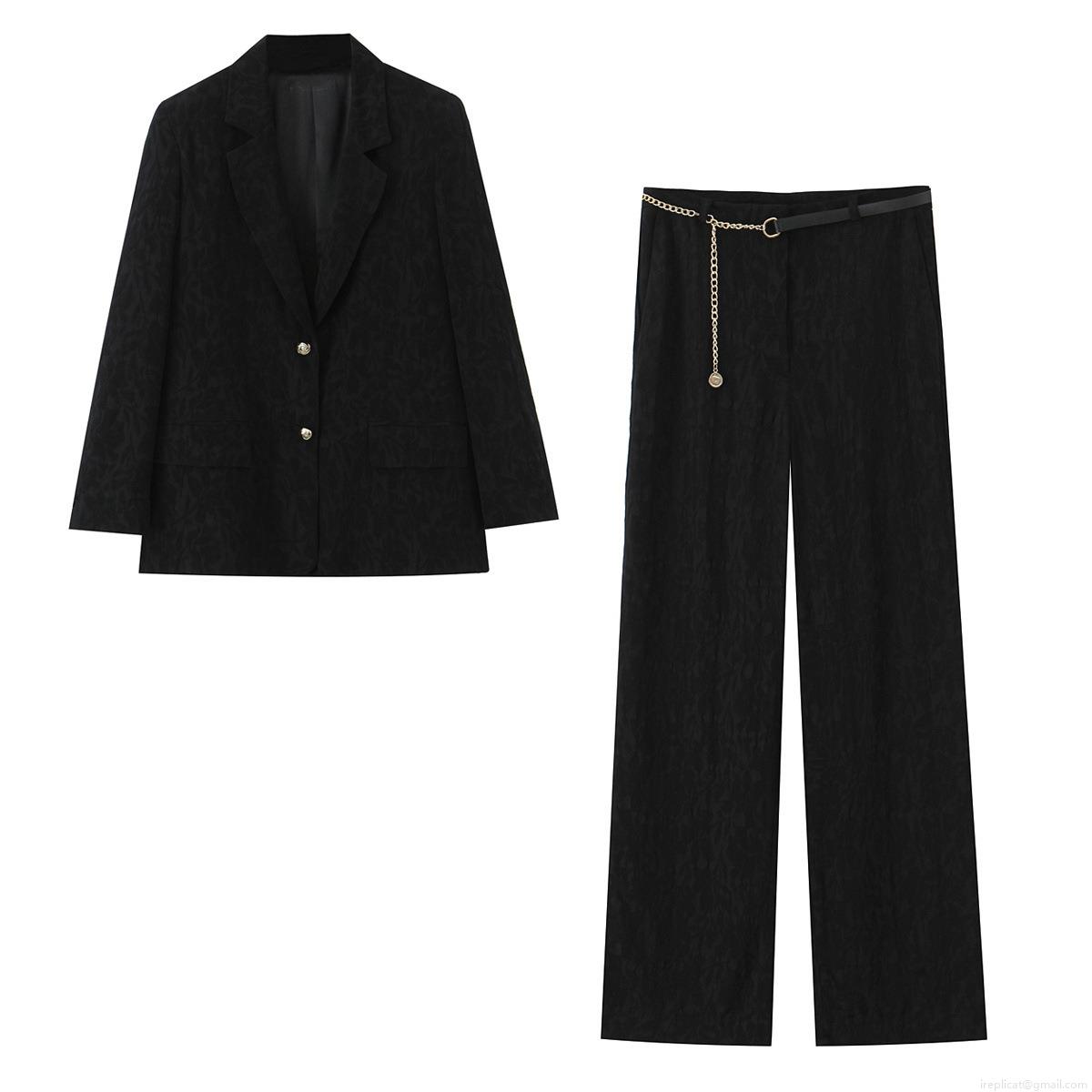 Women's Elegant Jacquard Blazer And Pants Set With Metal Chain Belt Shoulder Padded Long Sleeve Black Street Style Suit For Office Party Ladies