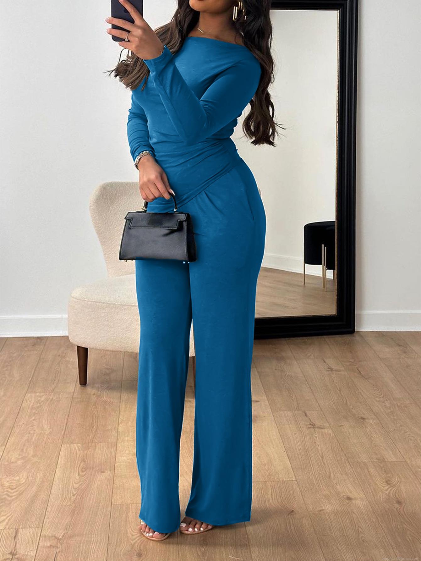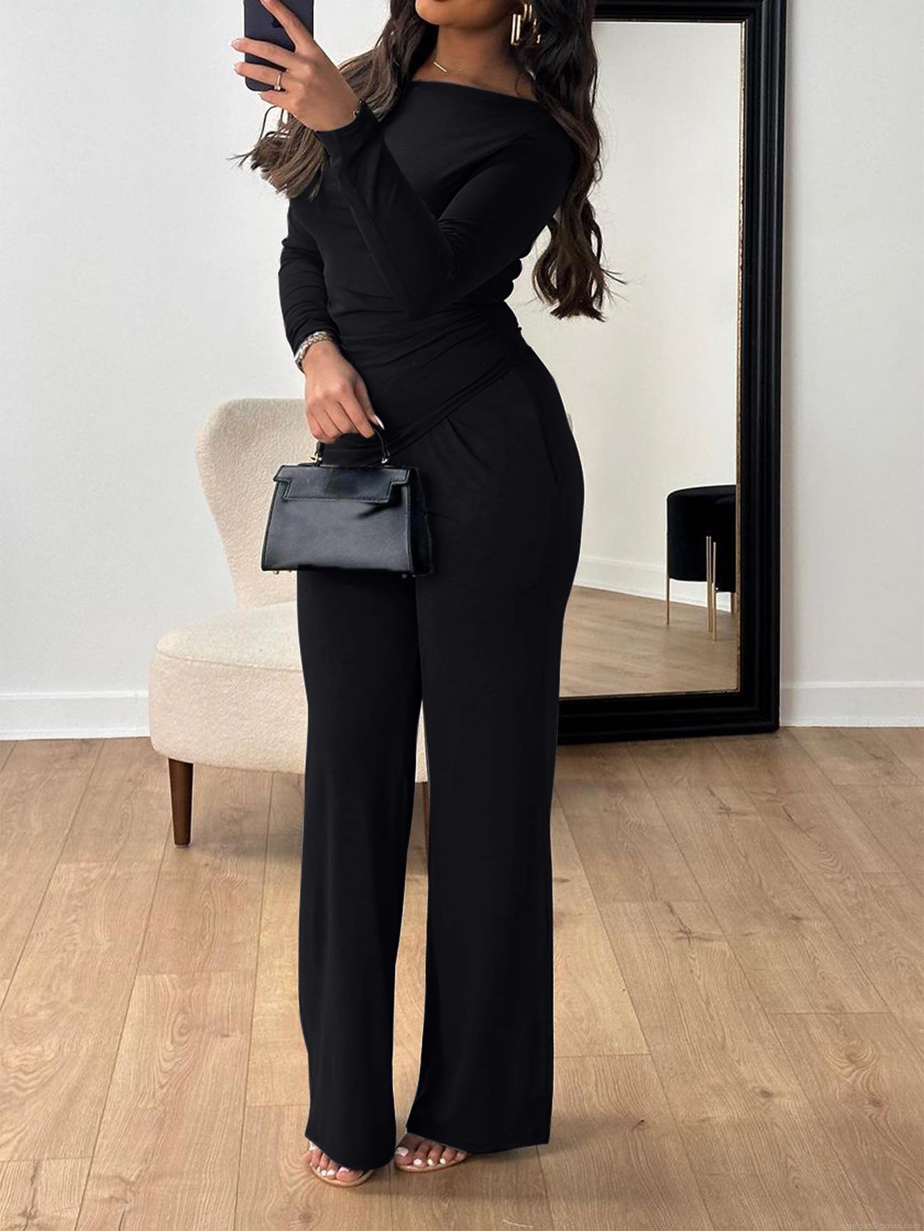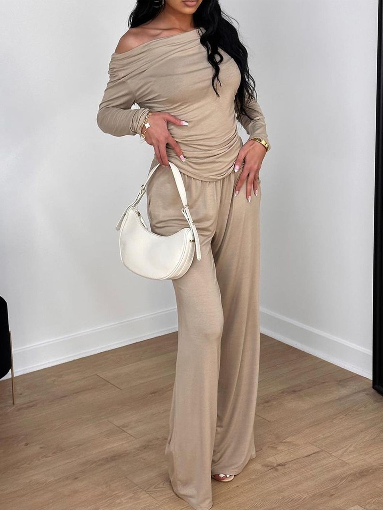 • Women's Elegant One Shoulder Long Sleeve Top And Wide Leg Pants Two Piece Set Casual Ruched Solid Color Outfits For Daily Wear Party Fashion
