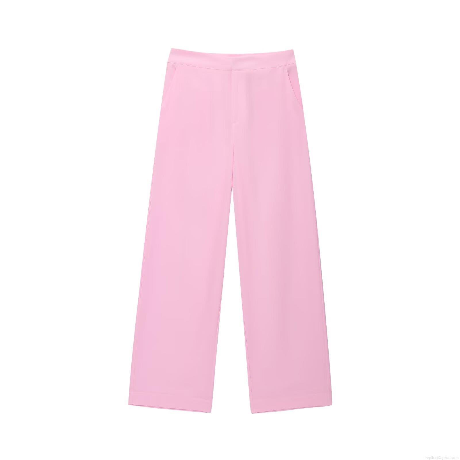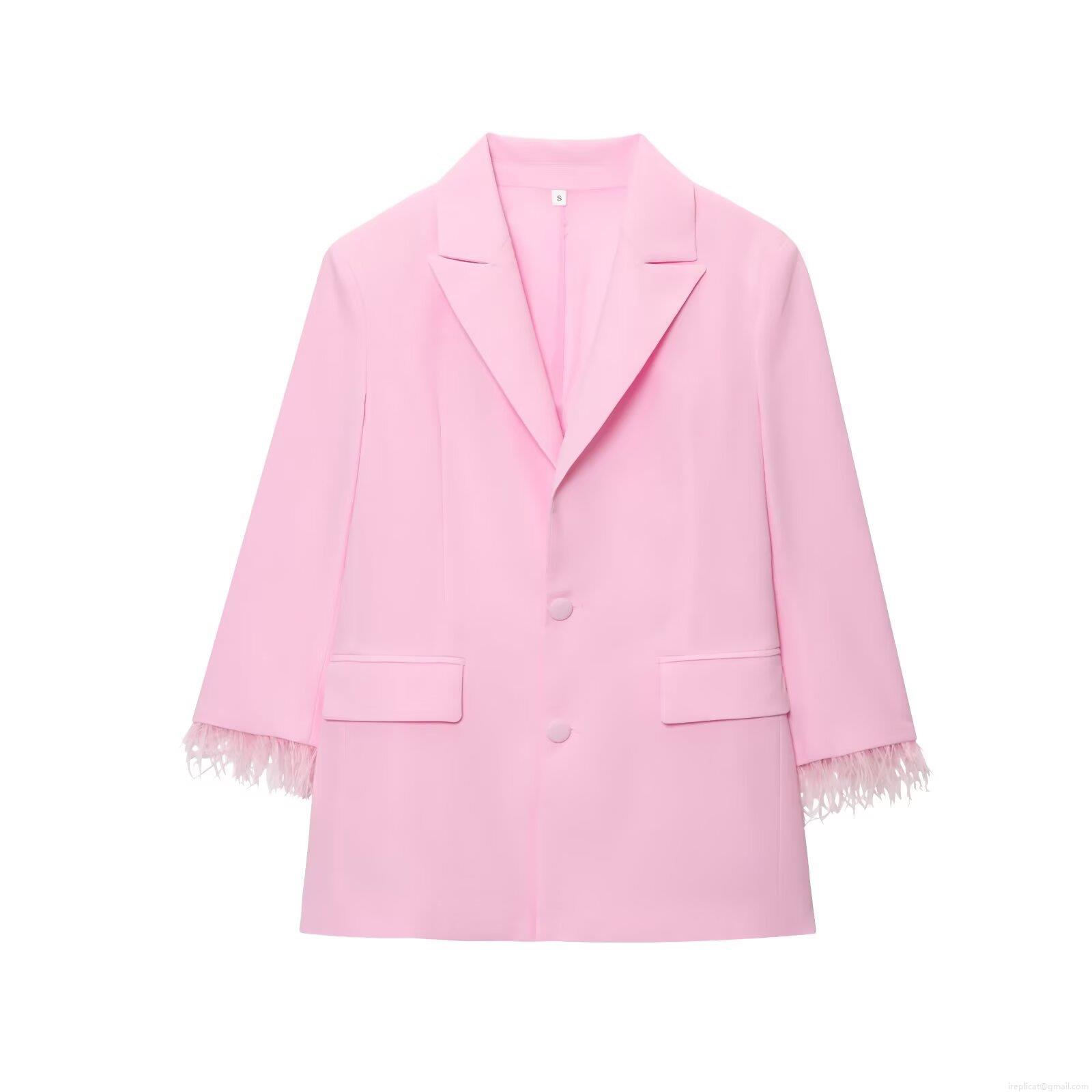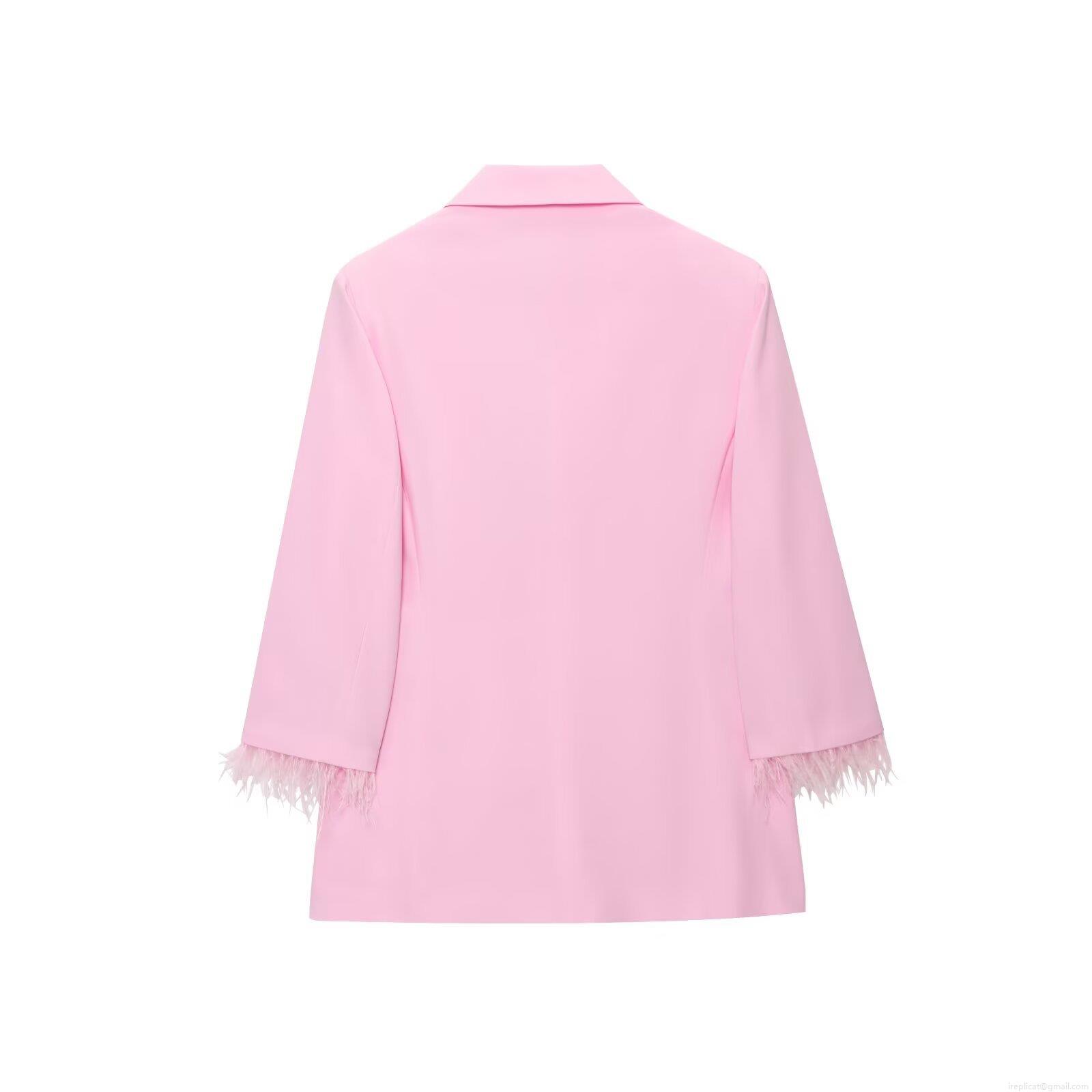 • Women's Elegant Pink Two Piece Blazer Set Feather Cuff Long Sleeve Double Breasted Jacket and High Waist Wide Leg Pants Professional Office Party Suit