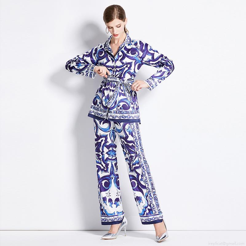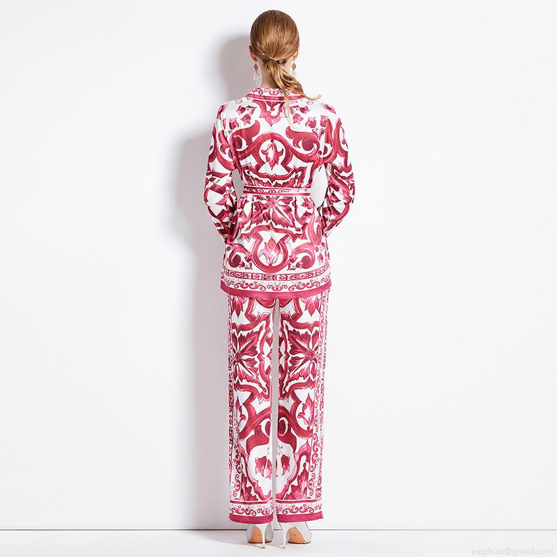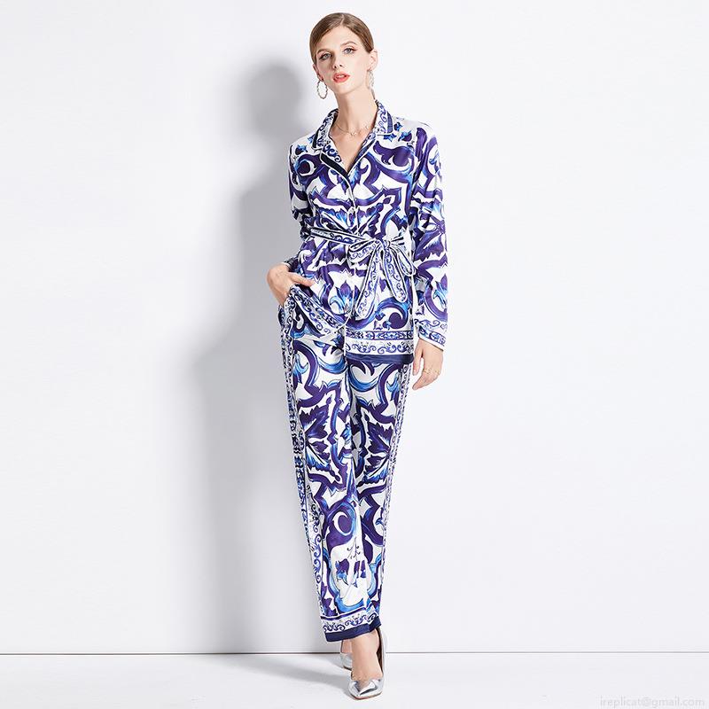 • Women's Elegant Print Two-Piece Pants Set Satin Long Sleeve Belted Lapel Shirt And Wide Leg Trousers Sicilian Style Casual Commute Outfit For Ladies
