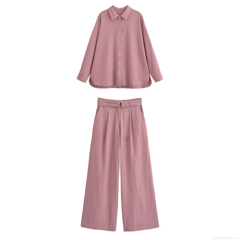 • Women's Elegant Two Piece Pants Set 100% Polyester Long Sleeve Lapel Shirt and High Waist Wide Leg Belted Pants Mauve Solid Color Casual Streetwear Outfit for Women