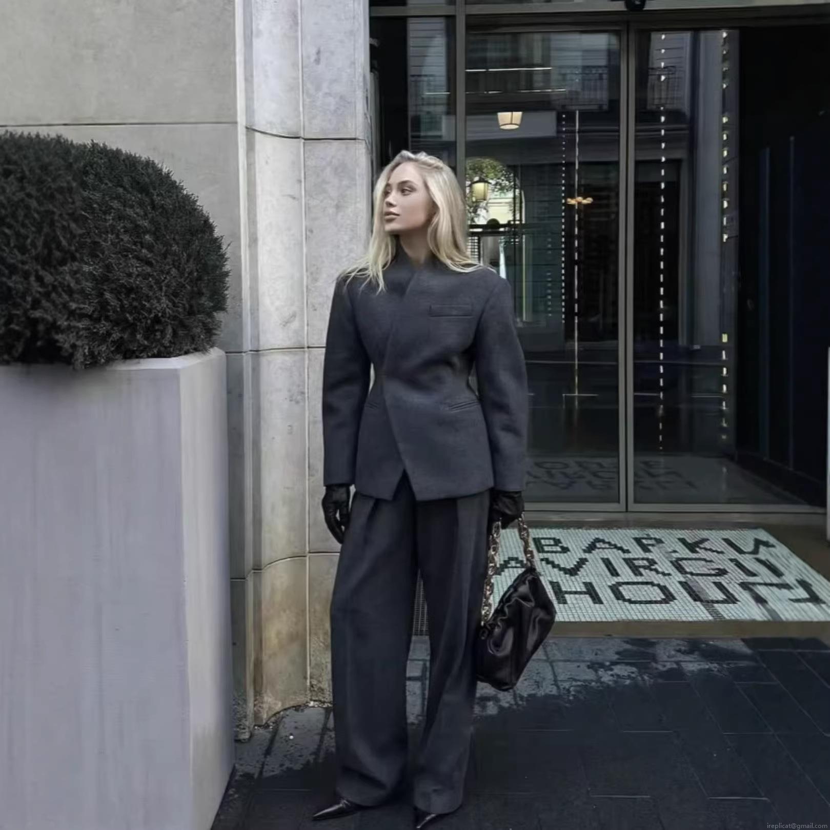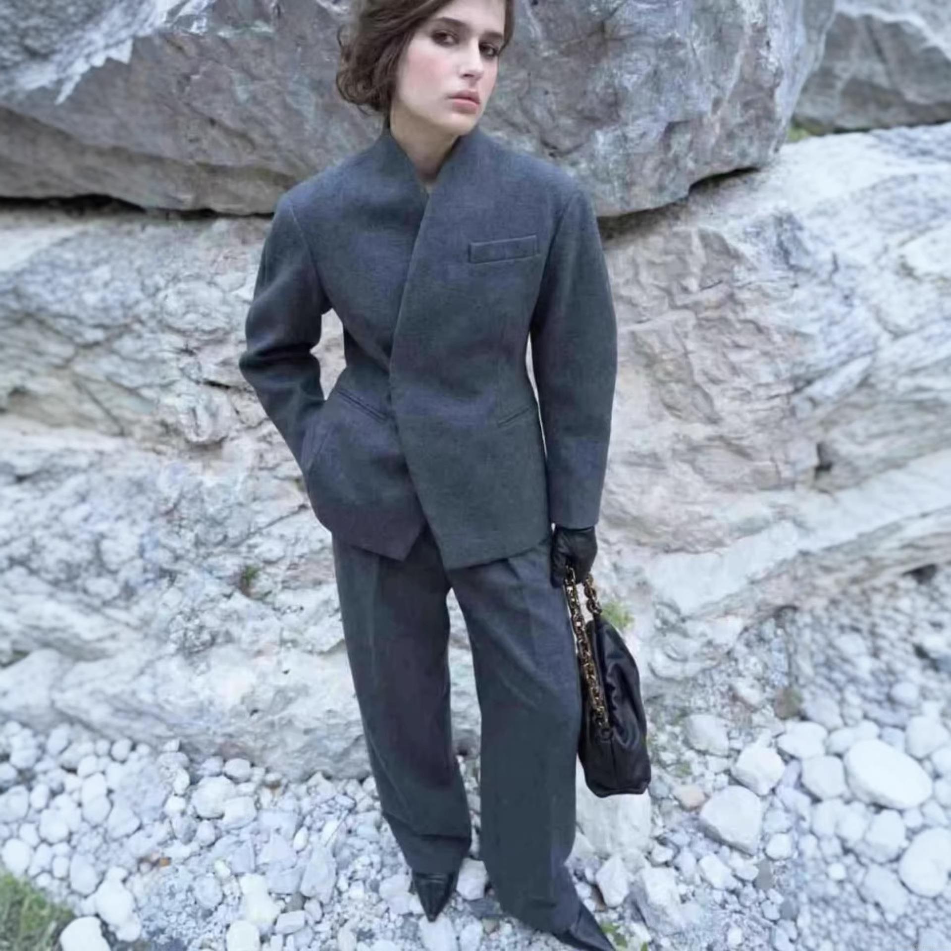 • Women's Elegant Two Piece Suit Set Woolen Texture Asymmetric Wrap Blazer and High Waist Wide Leg Trousers Solid Color Office Lady Streetwear Autumn Winter Sets
