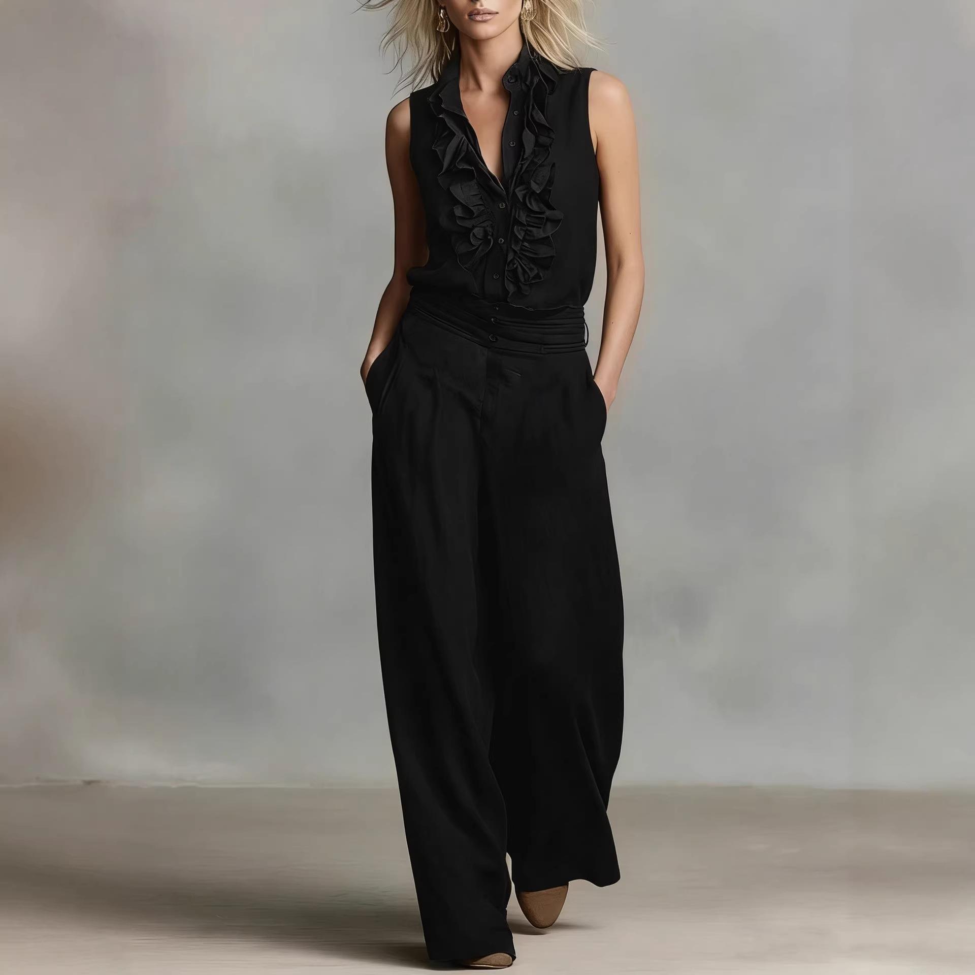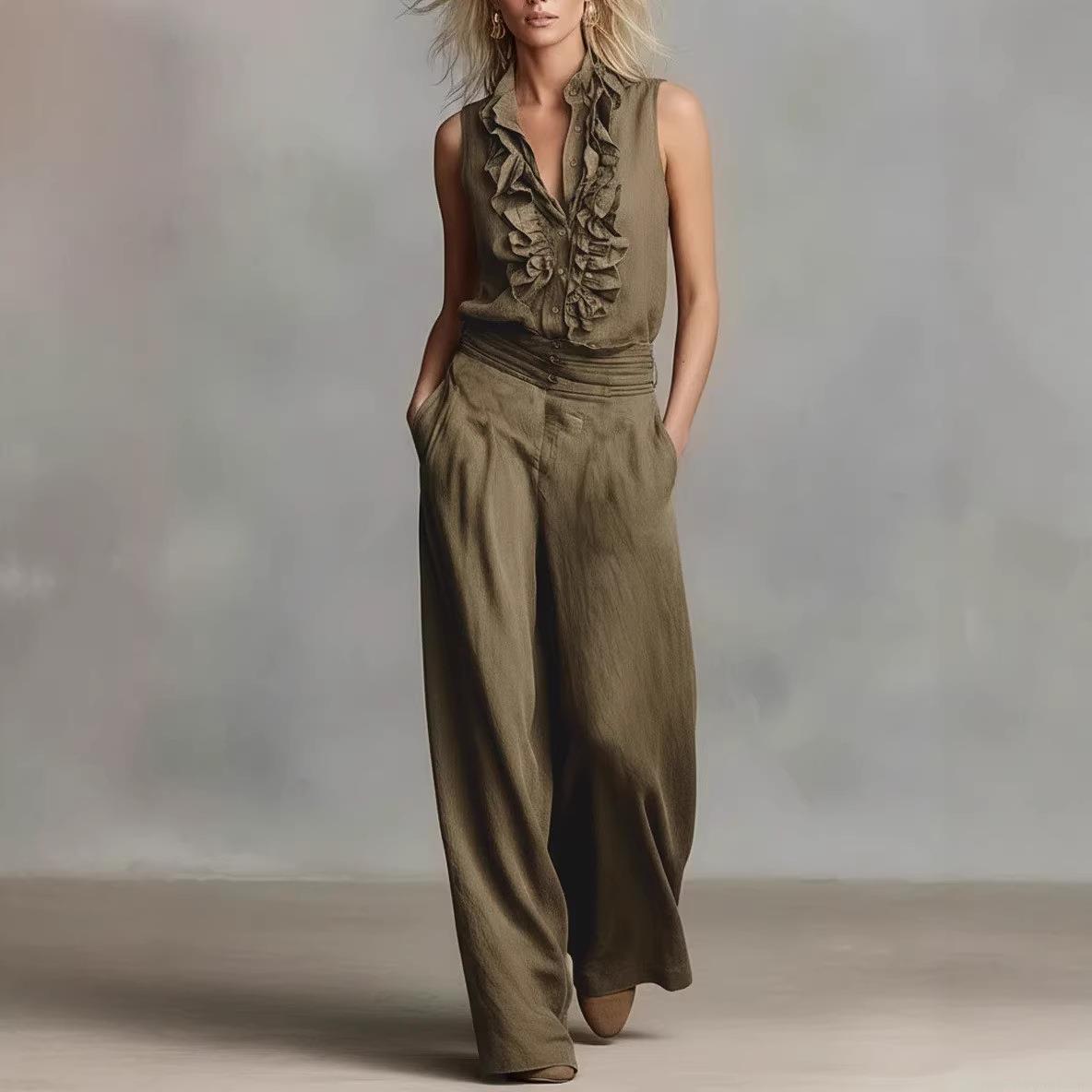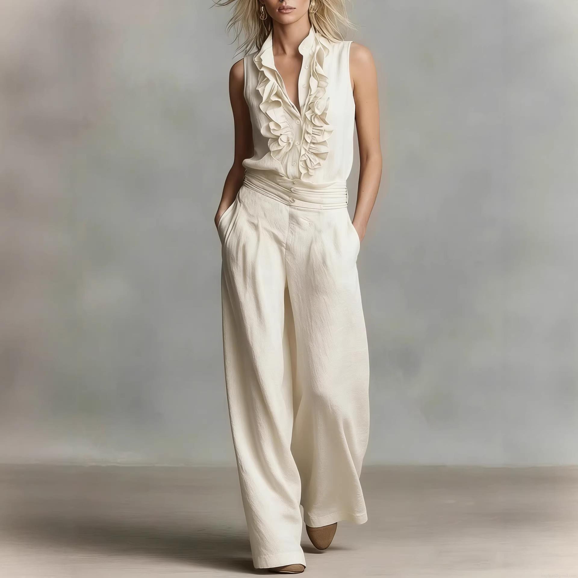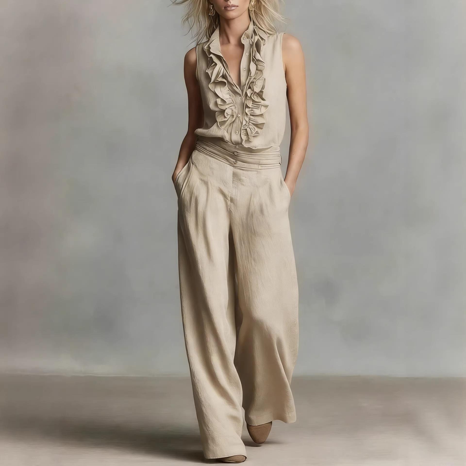 • Women's Elegant Two-Piece Pants Set Polyester V-Neck Ruffle Sleeveless Shirt High Waist Wide Leg Long Pants Summer Casual Office Commute Outfit