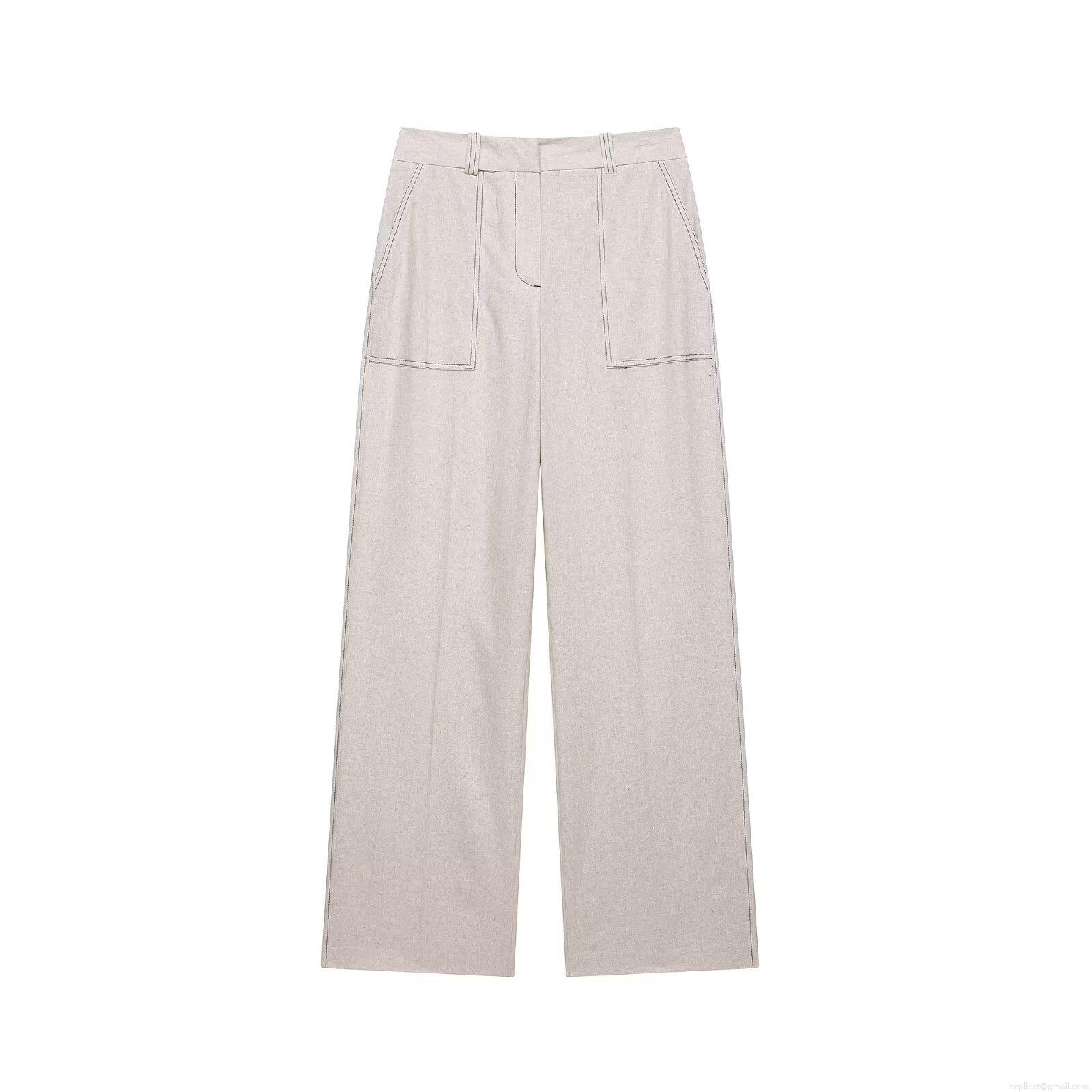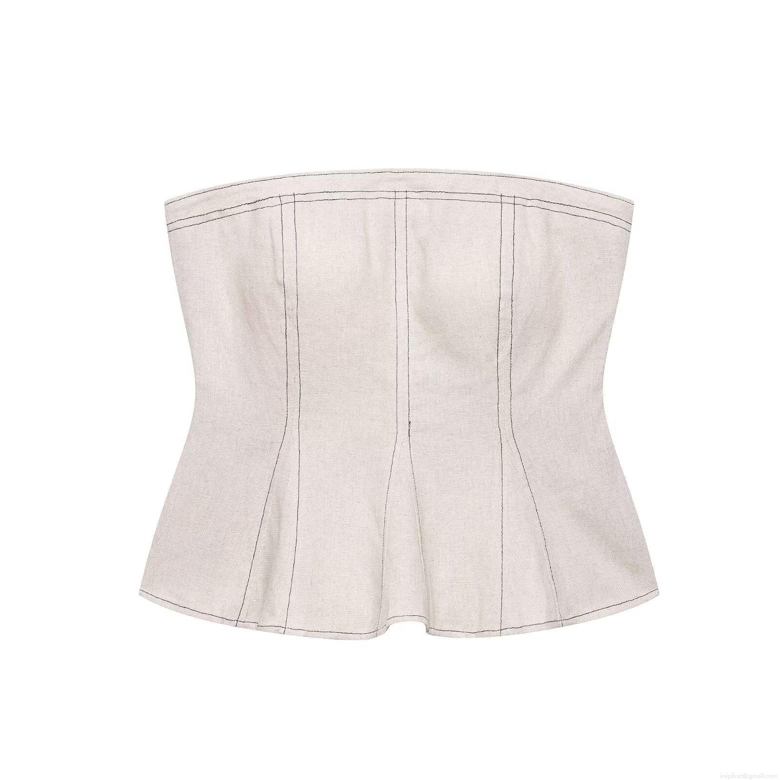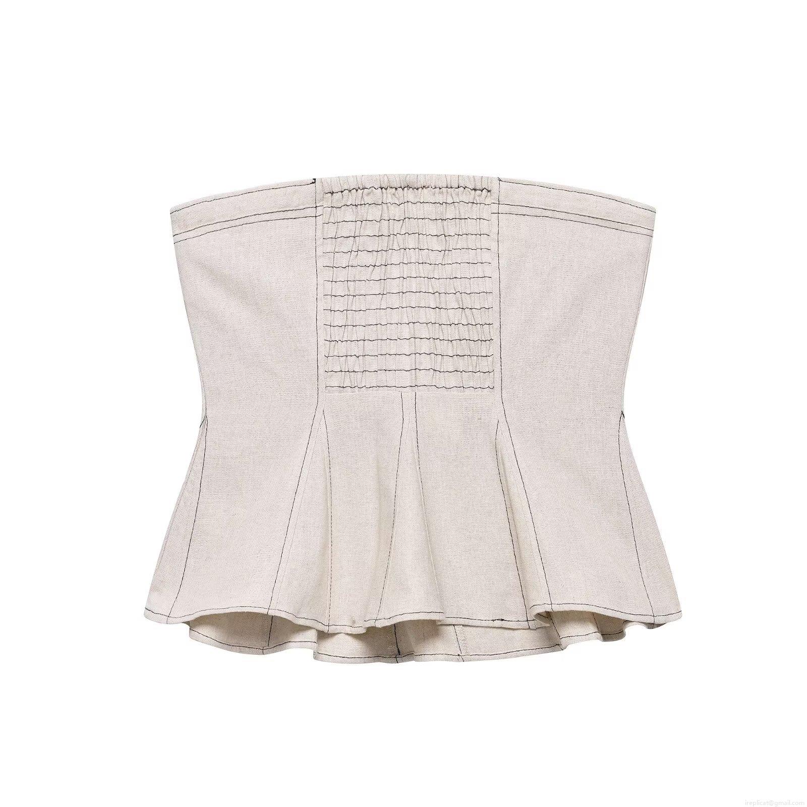 • Women's Elegant Two-Piece Set Cotton Linen Bandeau Tube Top With Ruffle Peplum Hem And High Waist Wide Leg Pants Contrast Stitching Sleeveless Street Style Summer Outfit