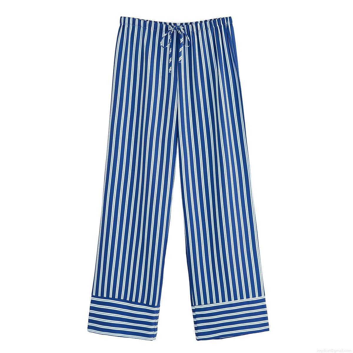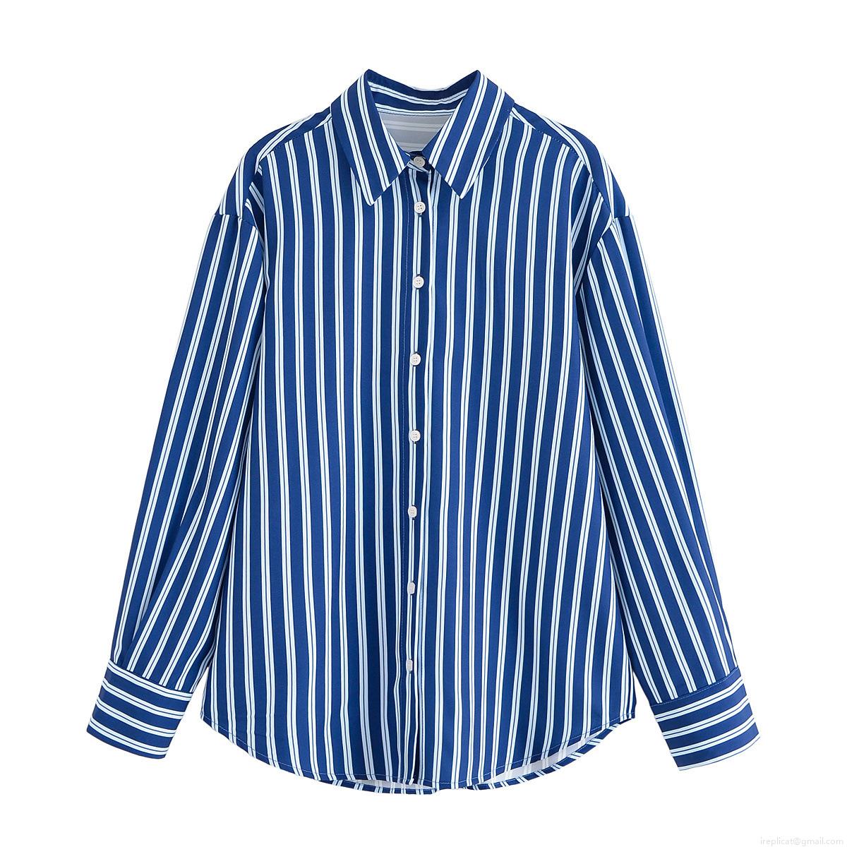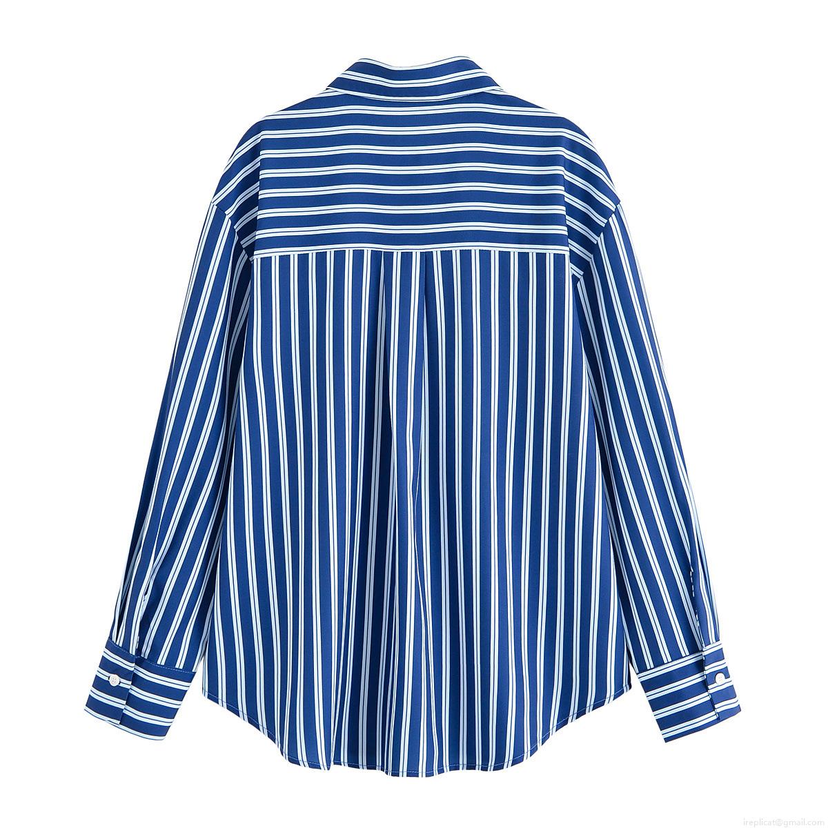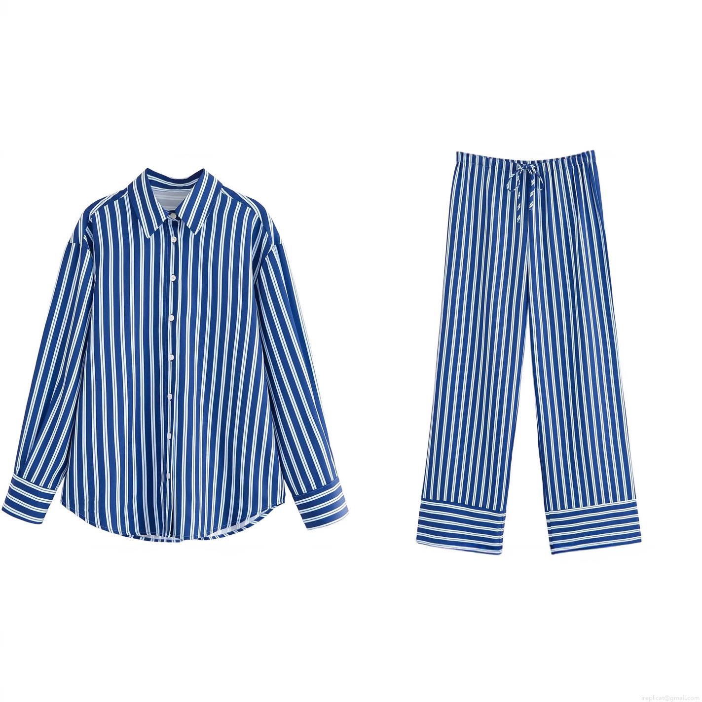 • Women's Fashion Blue White Stripe Two Piece Set Loose Long Sleeve Button Down Shirt And Wide Leg Drawstring Pants Casual Streetwear Summer Outfit