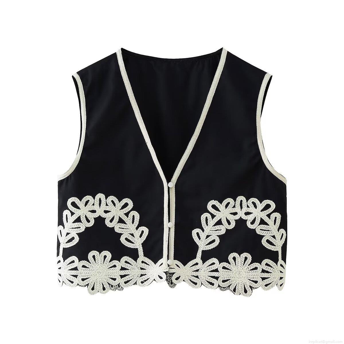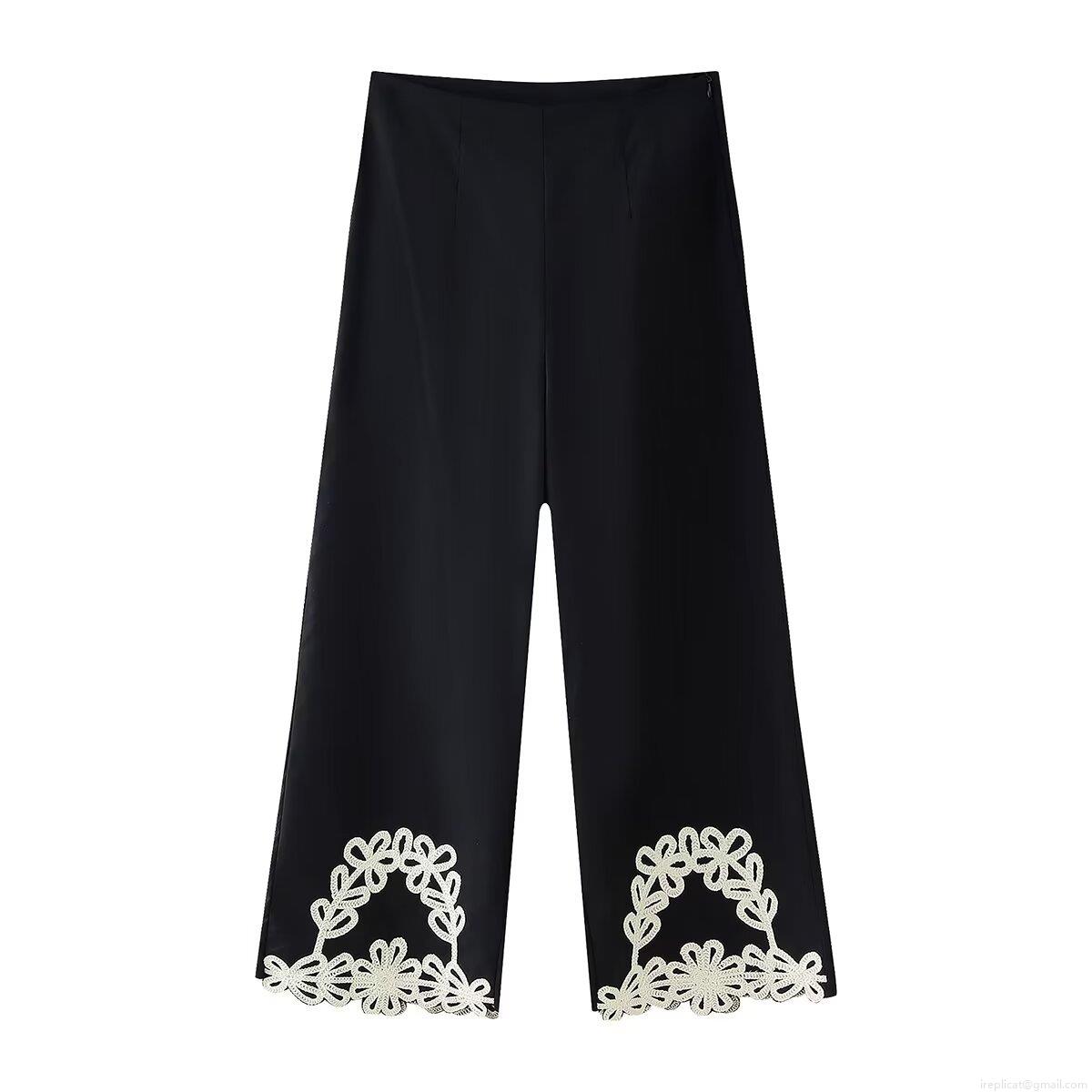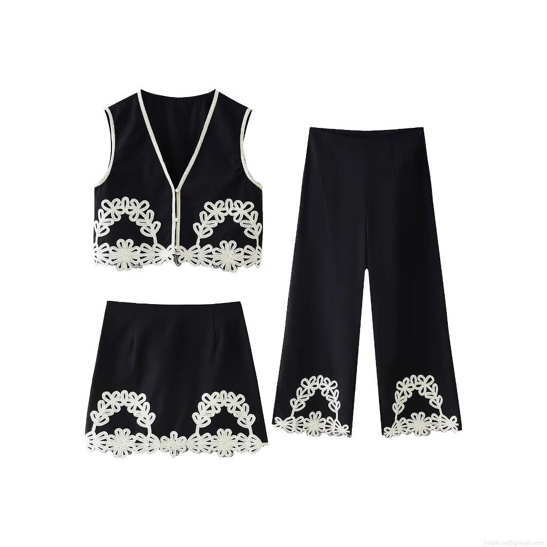 • Women's Fashion Embroidery V-Neck Vest Mini Skirt and Wide Leg Pants Three-Piece Outfits Elegant Floral Lace Patchwork Black Woven Streetwear Set