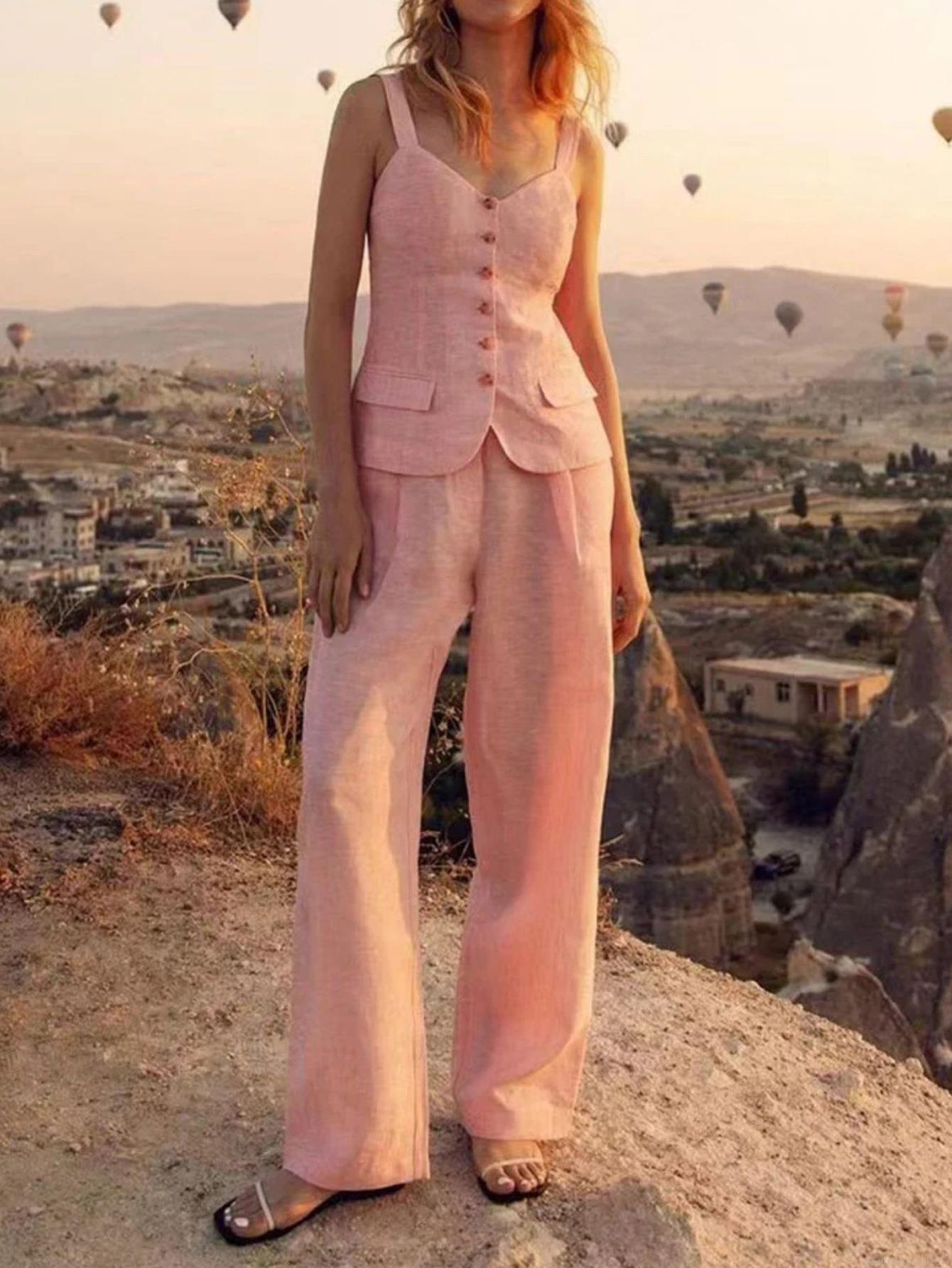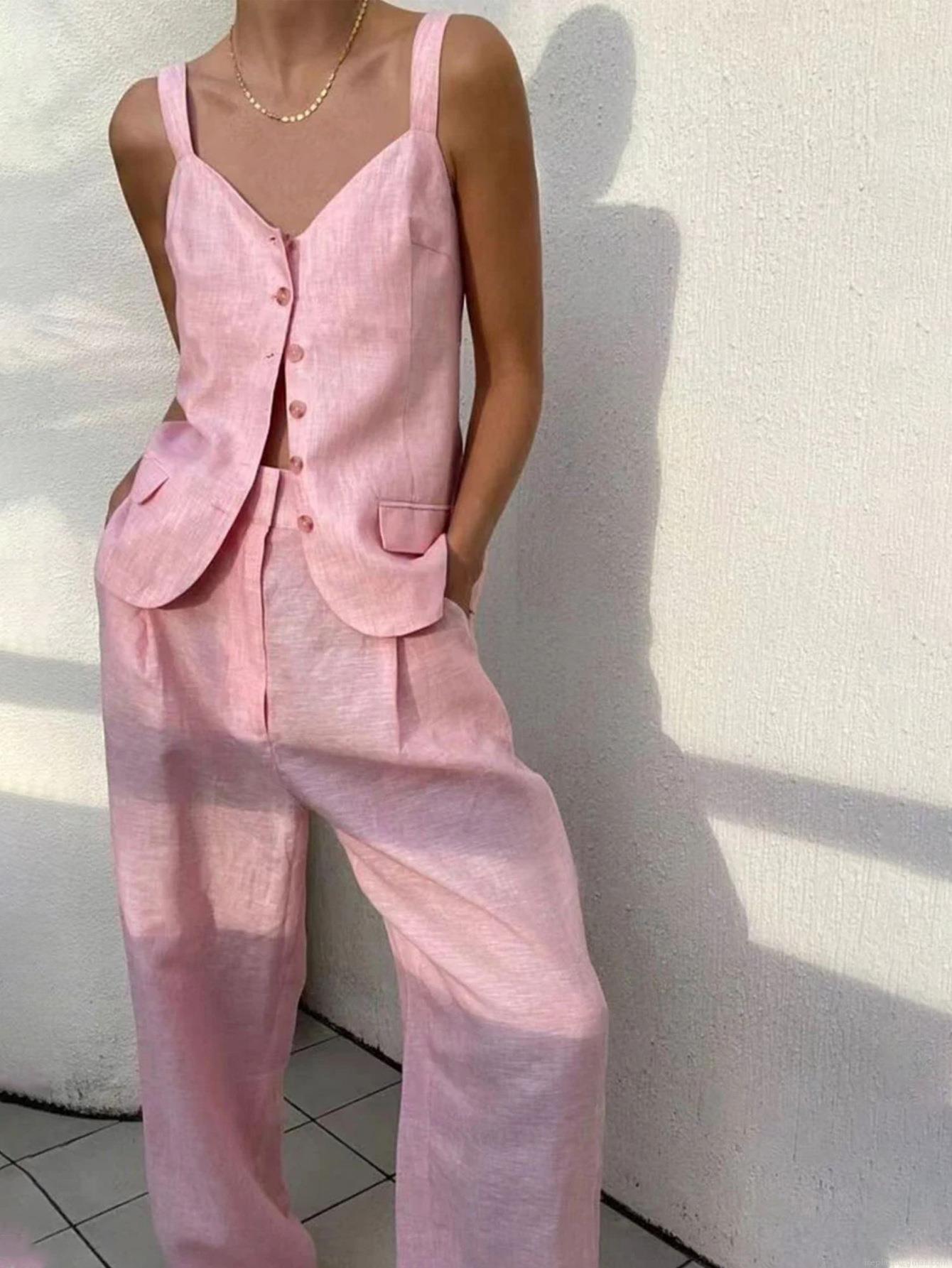 • Women's Fashion Pink Polyester Linen Feel Vest and Pants Two-Piece Set V-Neck Single Breasted Waistcoat and High Waist Wide Leg Trousers Casual Summer Vacation Suit