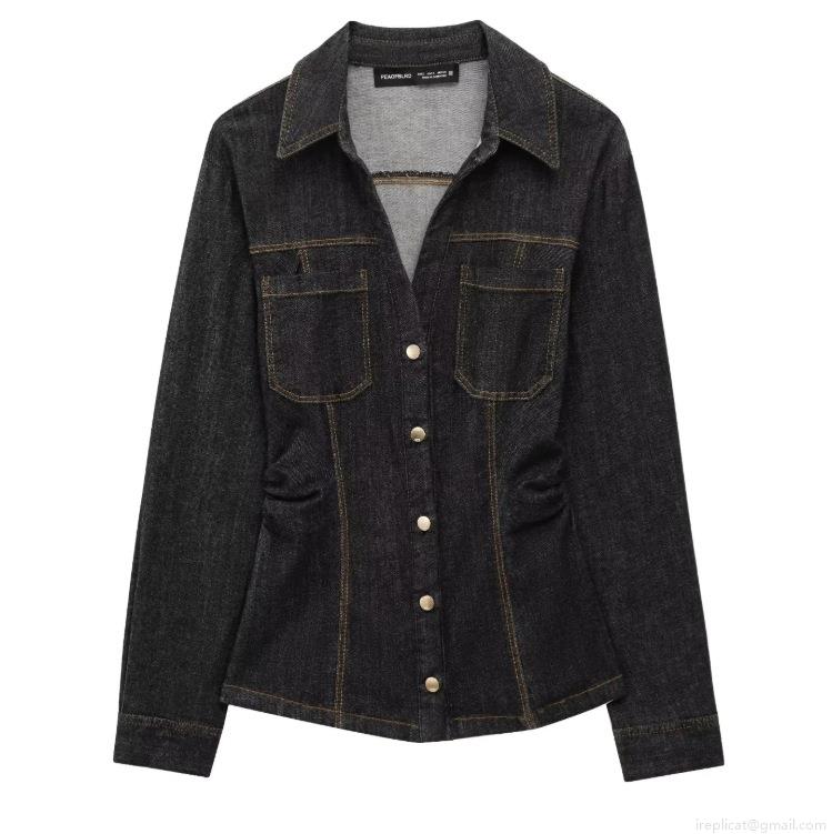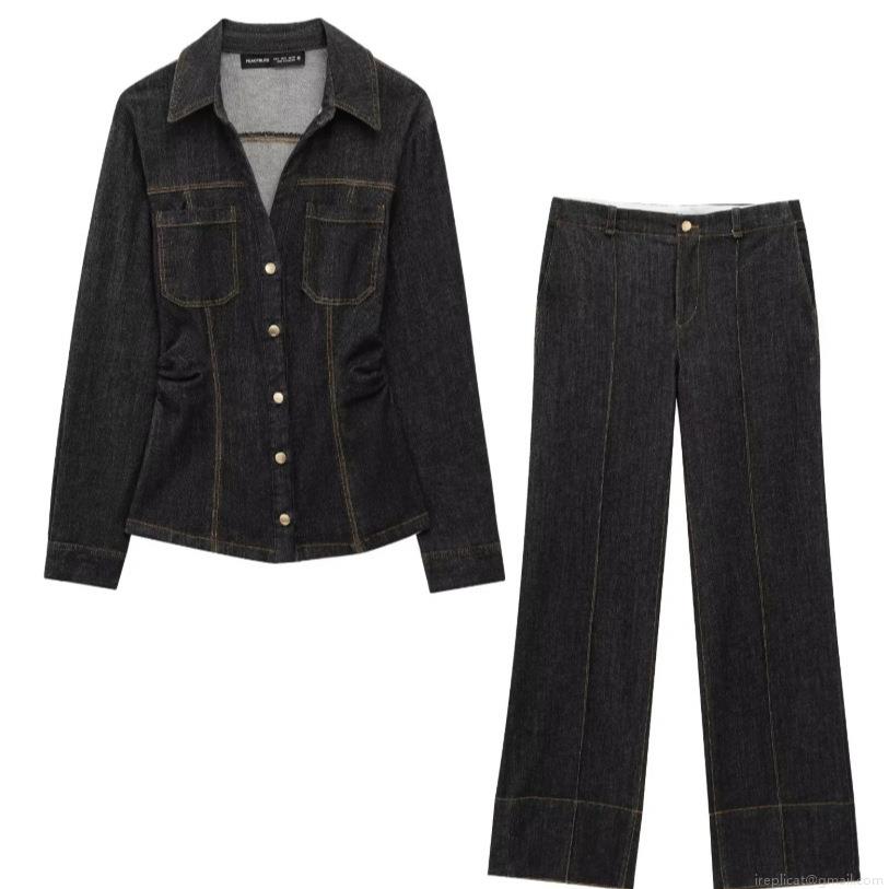 Women's Fashion Slim Denim Shirt and High Waisted Straight Leg Pants Two-Piece Set Long Sleeve Button Down Top with Contrast Stitching Streetwear Suit