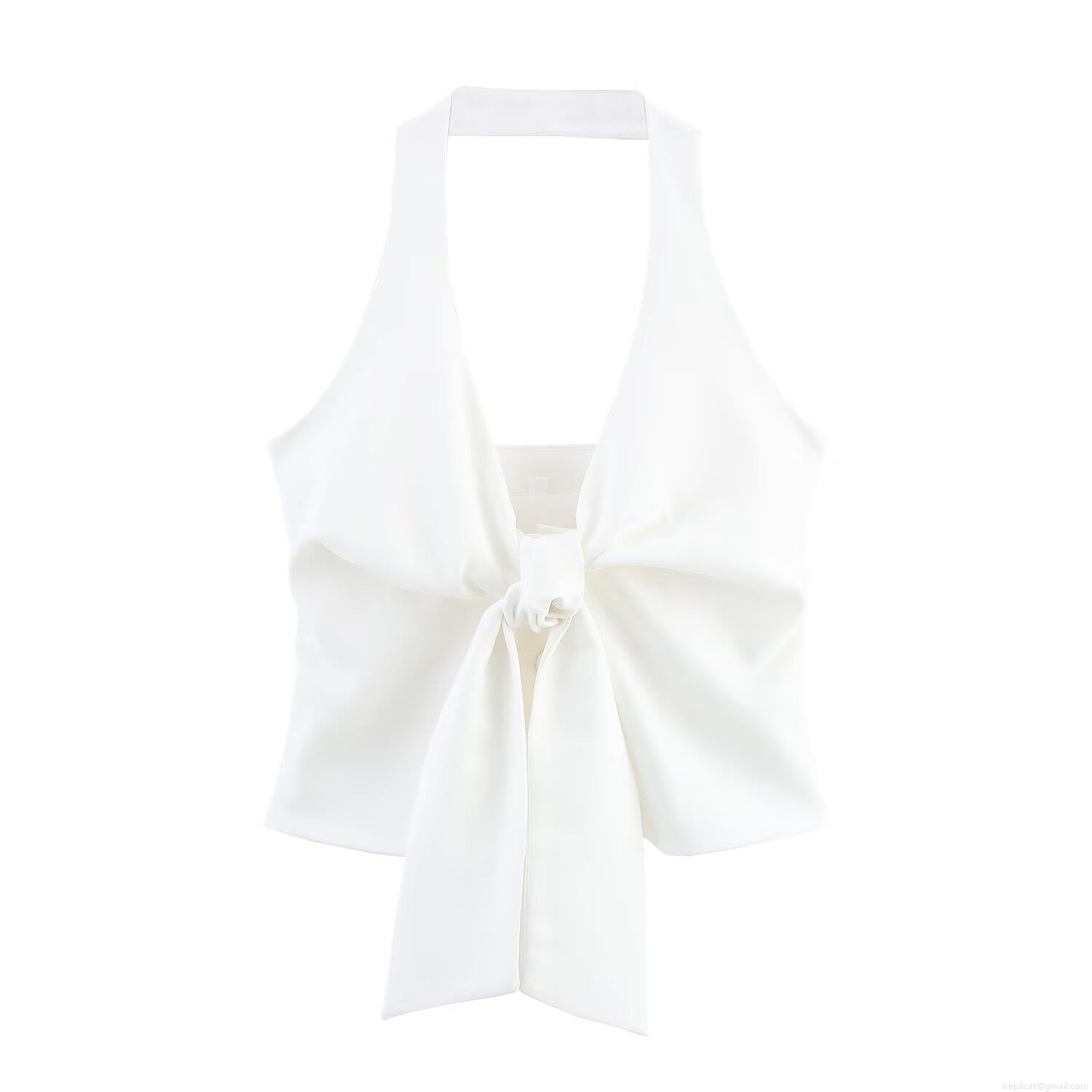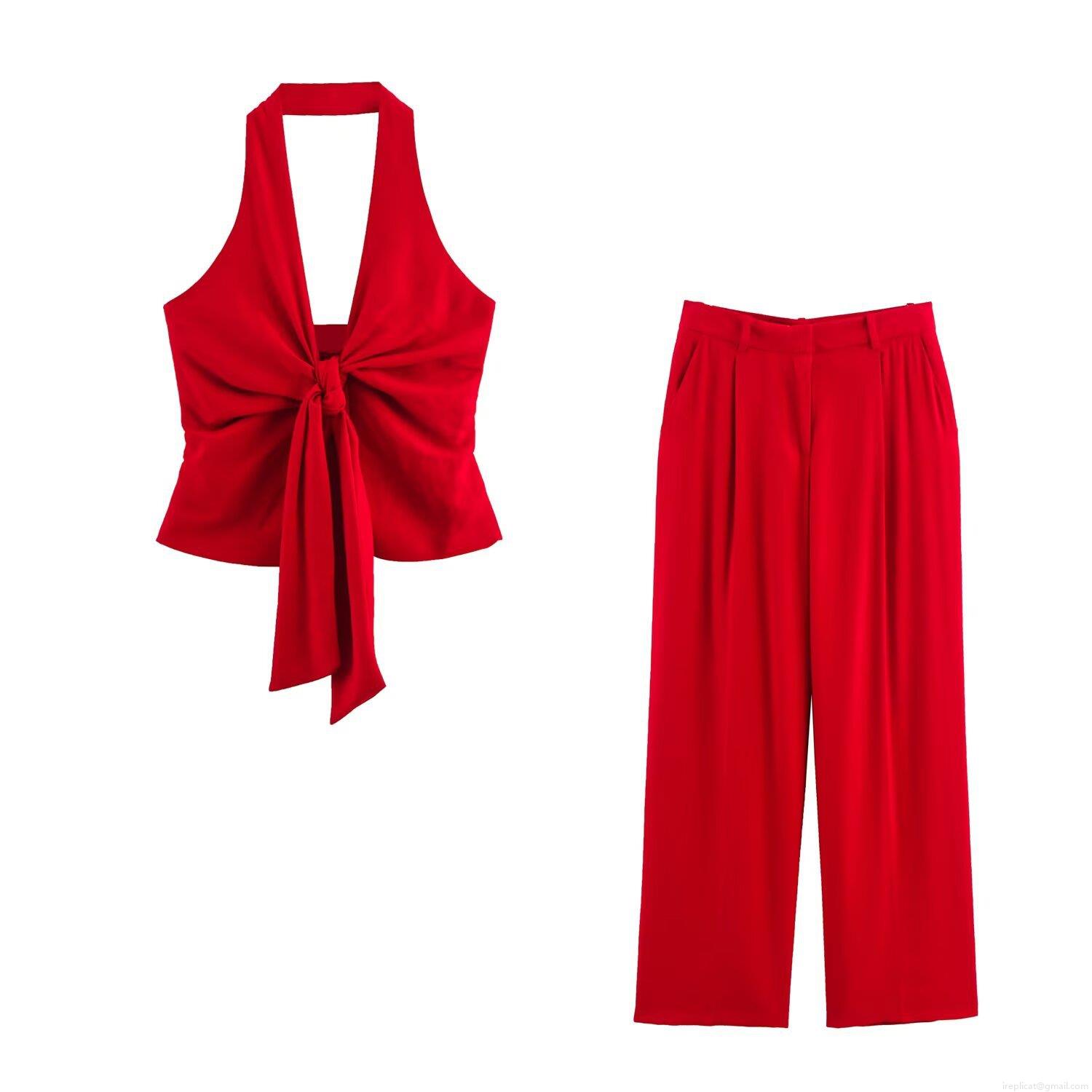 • Women's Fashion Two Piece Set Halter Bow Tie Crop Top And High Waist Pleated Wide Leg Pants Polyester Elegant Streetwear Casual Suit For Party