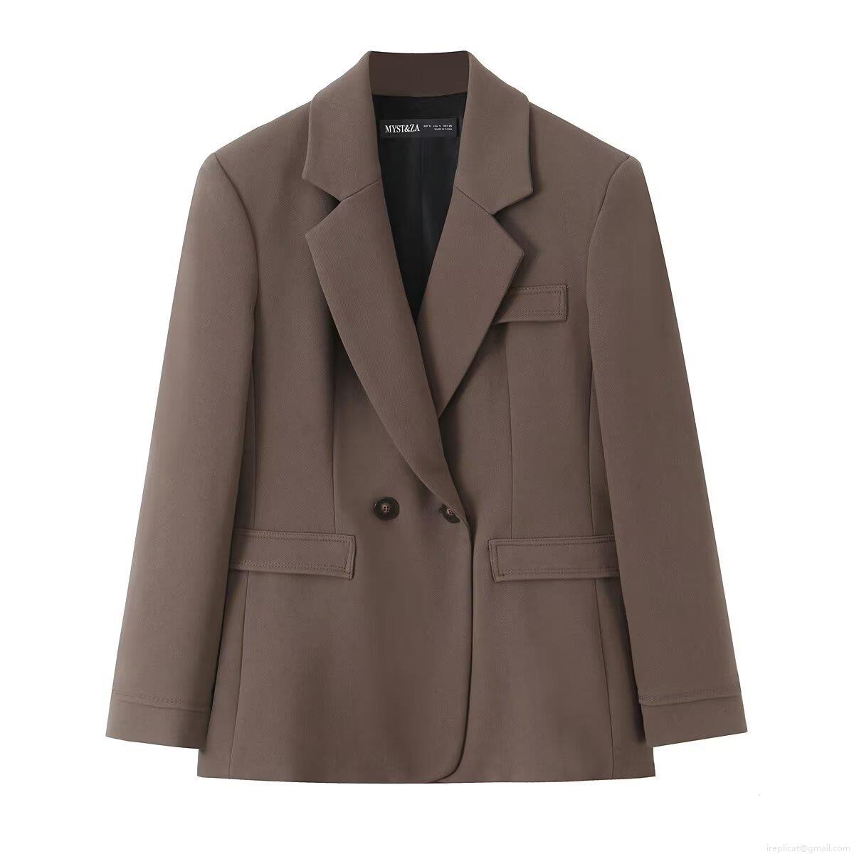 • Women's Fashion Two-Piece Blazer Pants Set Polyester Double Breasted Padded Shoulder Blazer High Waist Wide Leg Trousers Mocha Brown Business Professional Outfit Suit