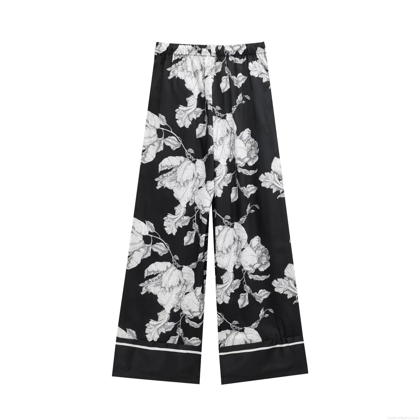 Flowers, Printing, Wide-leg, Satin Finish, Abstract Plant Texture, Pajama Style