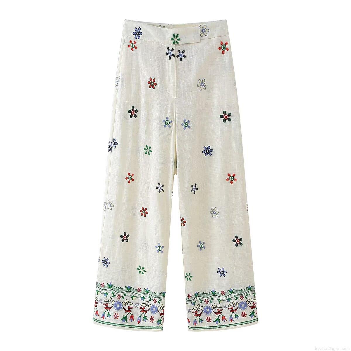 Embroidery, Flowers, Buttons, Lapel, Wavy Edge, Wide-leg