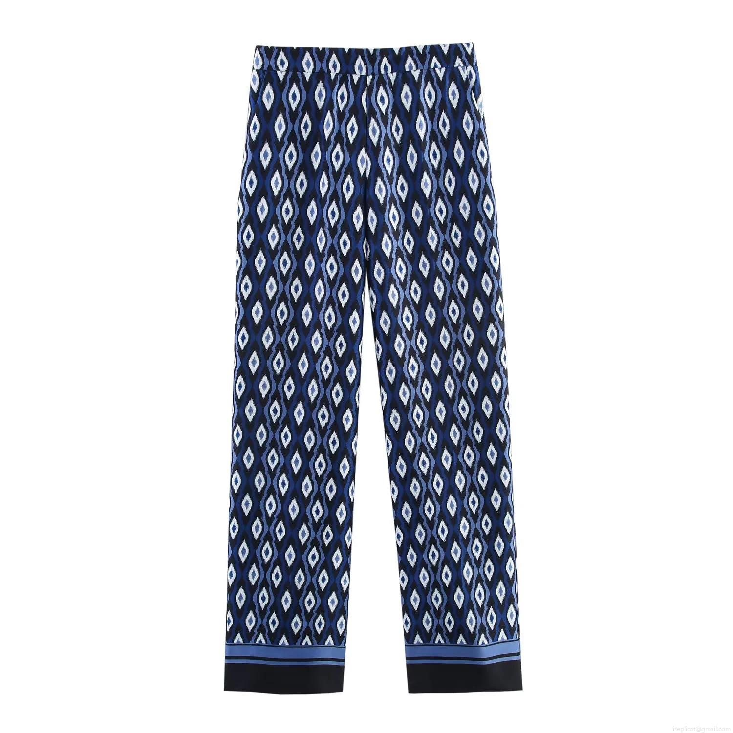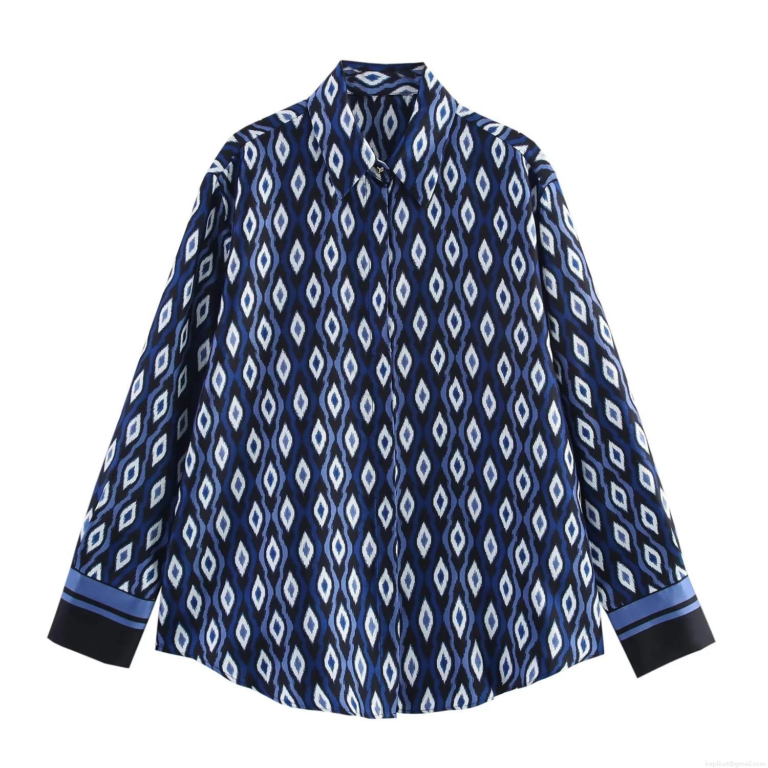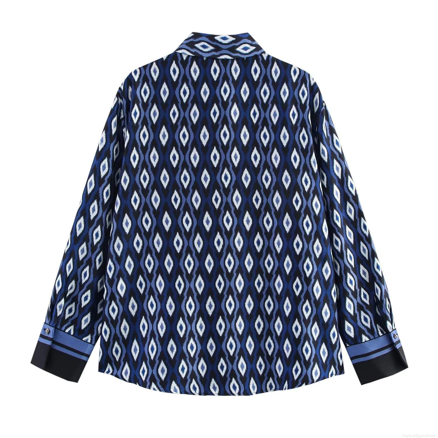 • Women's Geometric Diamond Print Satin Two Piece Set Long Sleeve Lapel Shirt And High Waist Wide Leg Pants Streetwear Casual Bohemian Outfit