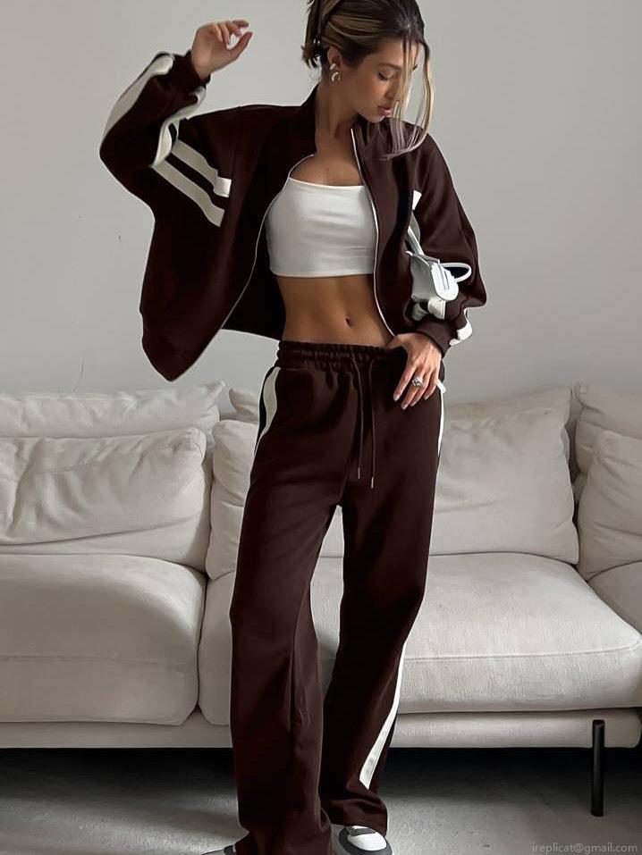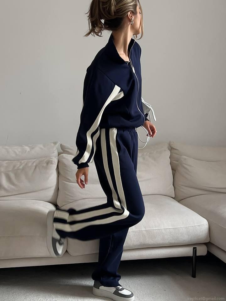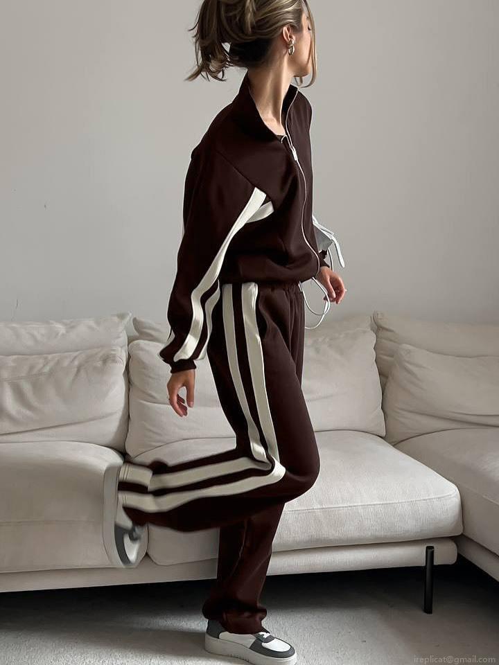 • Women's High Street Sporty Sweatshirt Two-Piece Set 100% Cotton Long Sleeve Zipper Jacket And Striped Wide Leg Pants Tracksuit Activewear Casual Streetwear