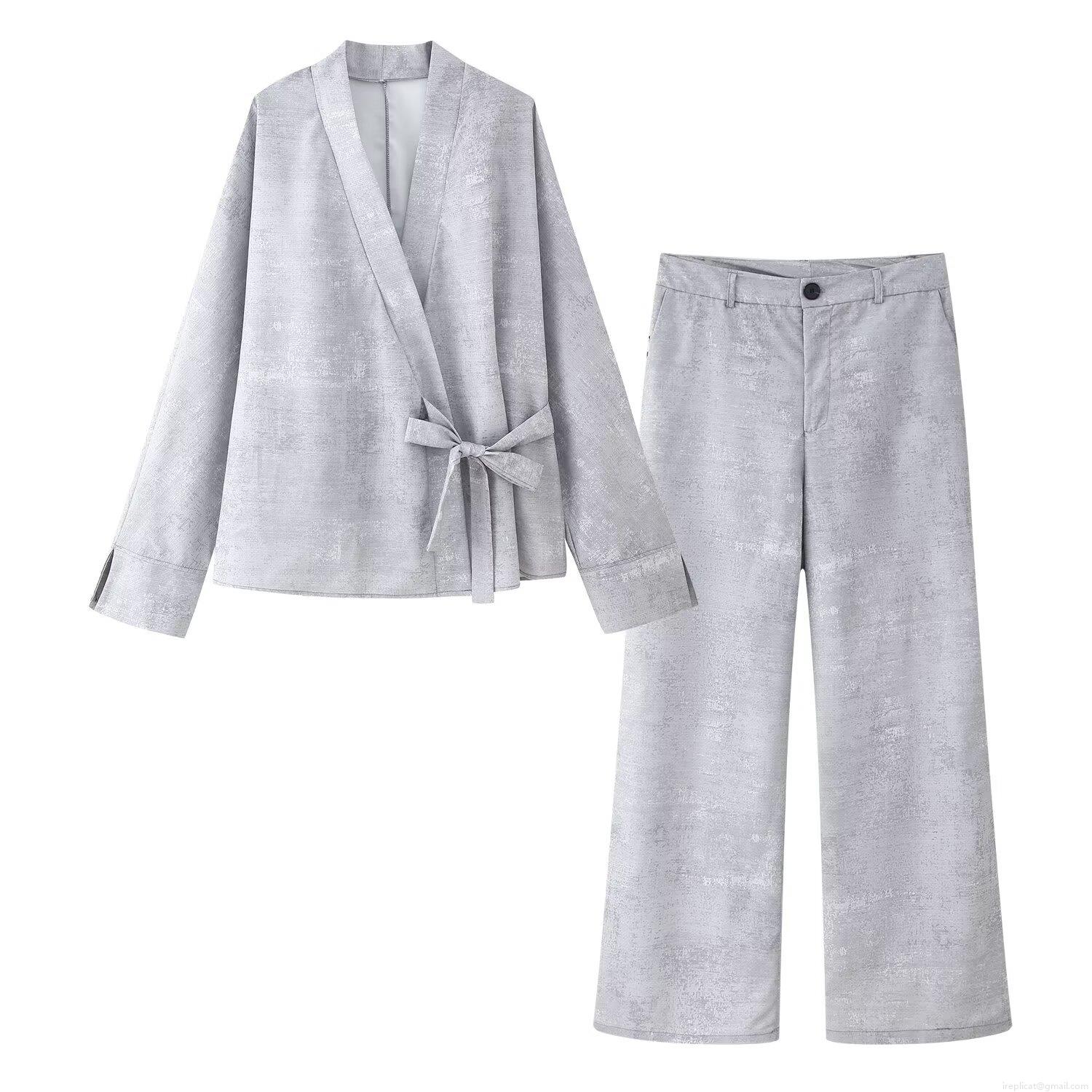 • Women's Kimono Style Tie Side Top and High Waist Wide Leg Pants Two Piece Set Mottled Texture Polyester Casual Suit Streetwear Autumn Clothing