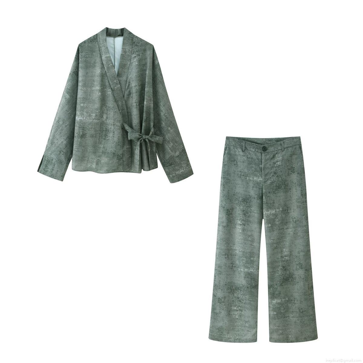 Women's Kimono Style Tie Side Top and High Waist Wide Leg Pants Two Piece Set Mottled Texture Polyester Casual Suit Streetwear Autumn Clothing