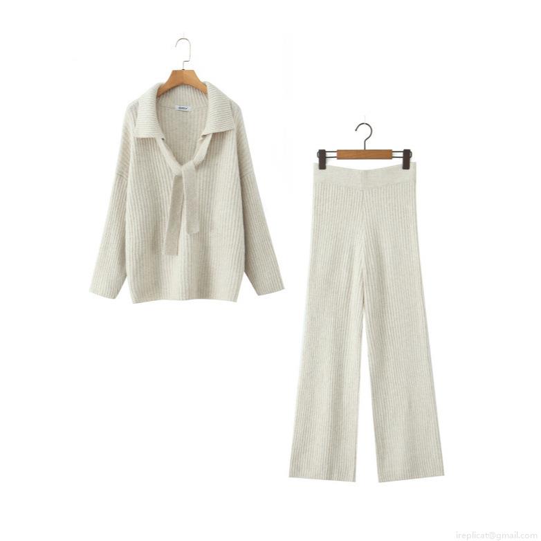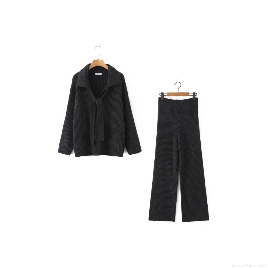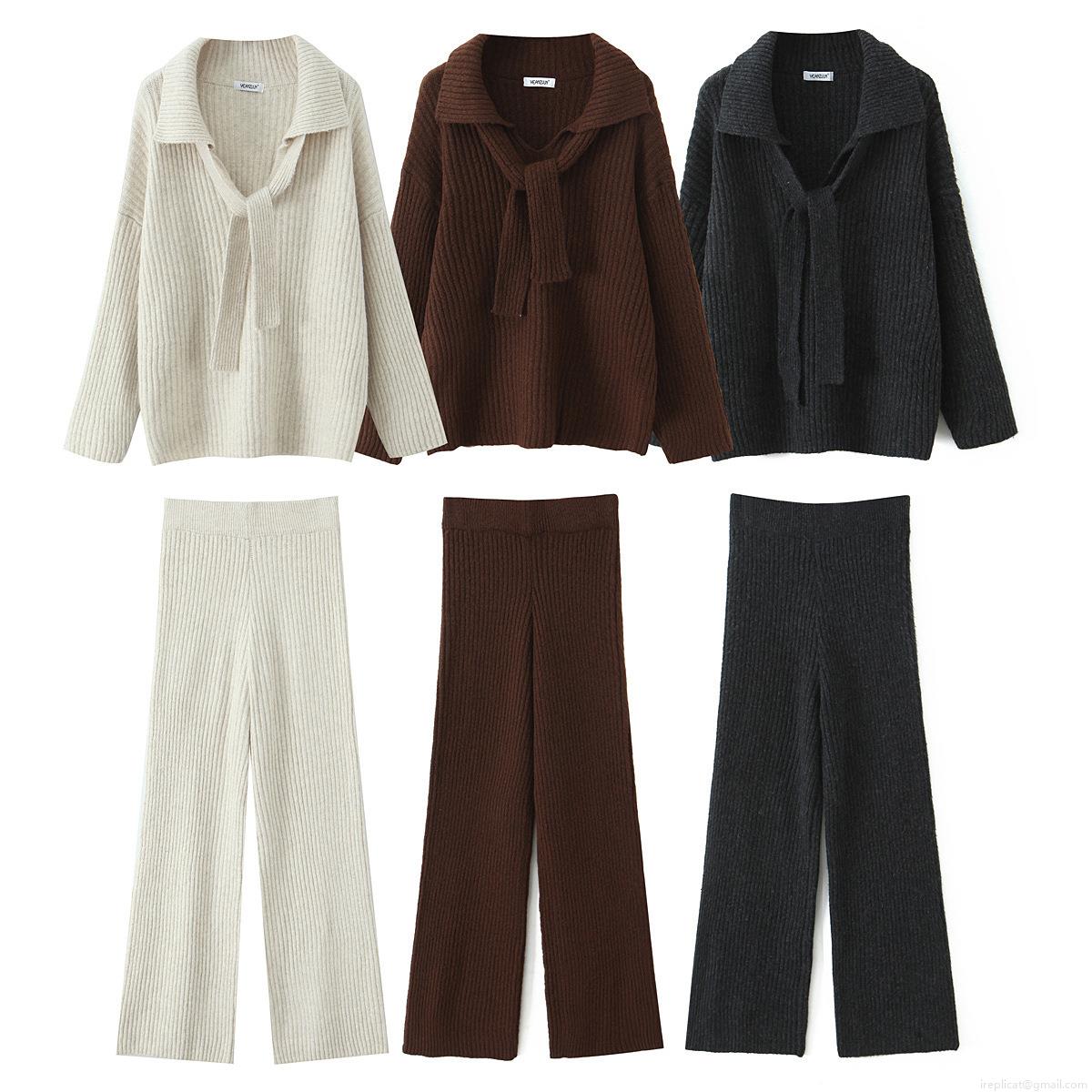• Women's Knit 2 Piece Sweater Set Ribbed Knit Acrylic Nylon Blend Loose V Neck Lace Up Long Sleeve Top Wide Leg Pants Casual Lounge Co-ord Set Streetwear