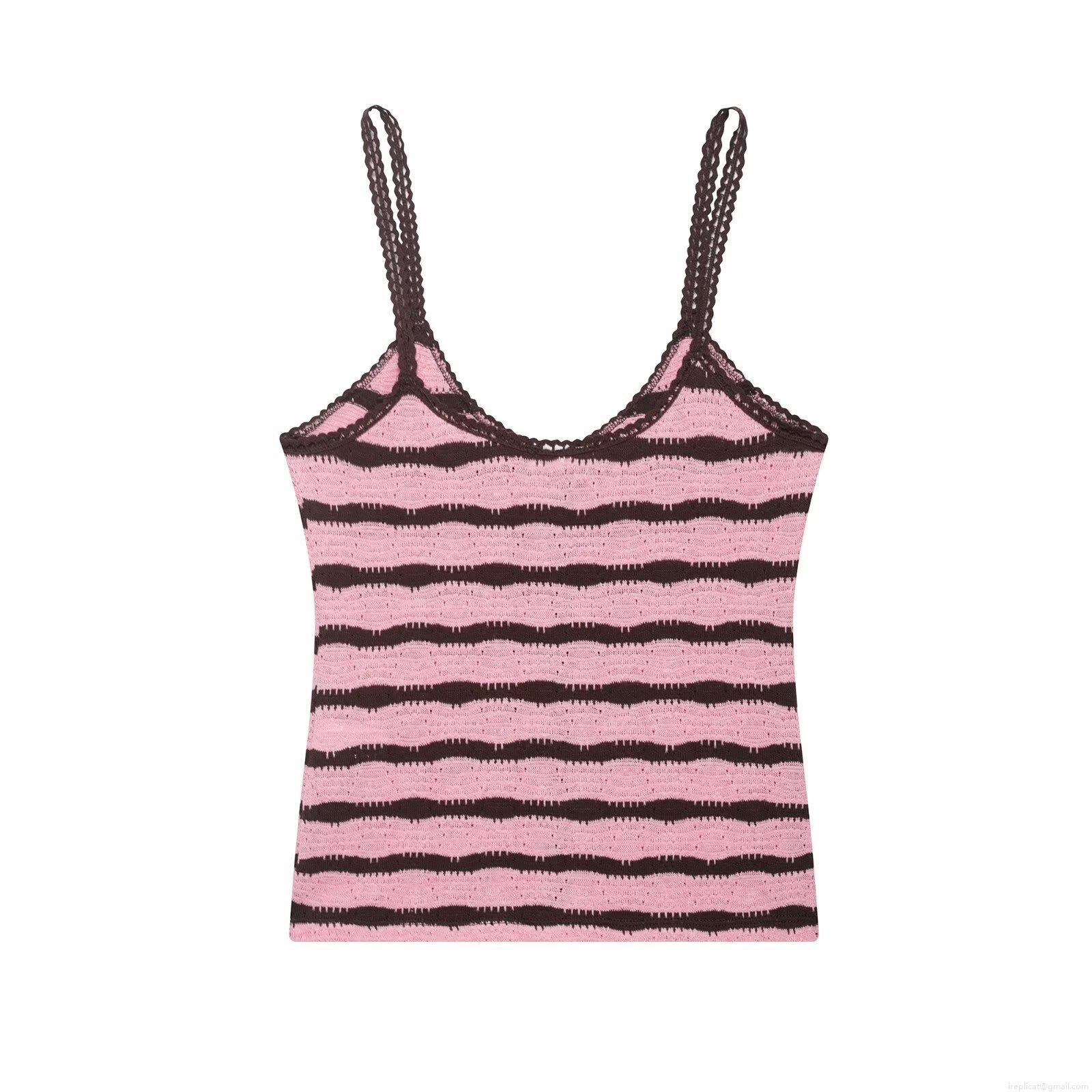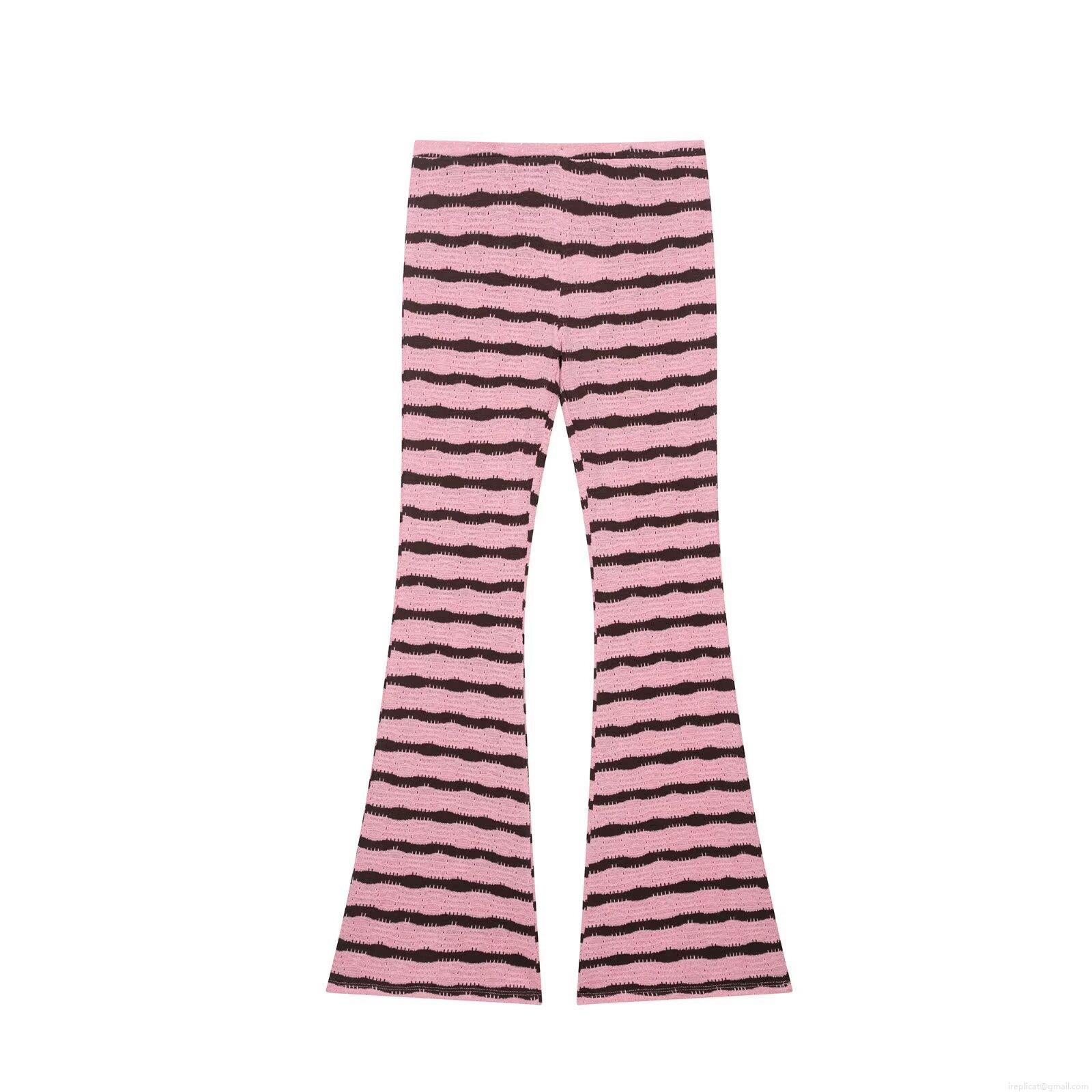 • Women's Knitted Striped Two Piece Set Polyester Crochet Lace Camisole Top With High Waist Flare Pants Casual Retro Streetwear Coordinates Outfit